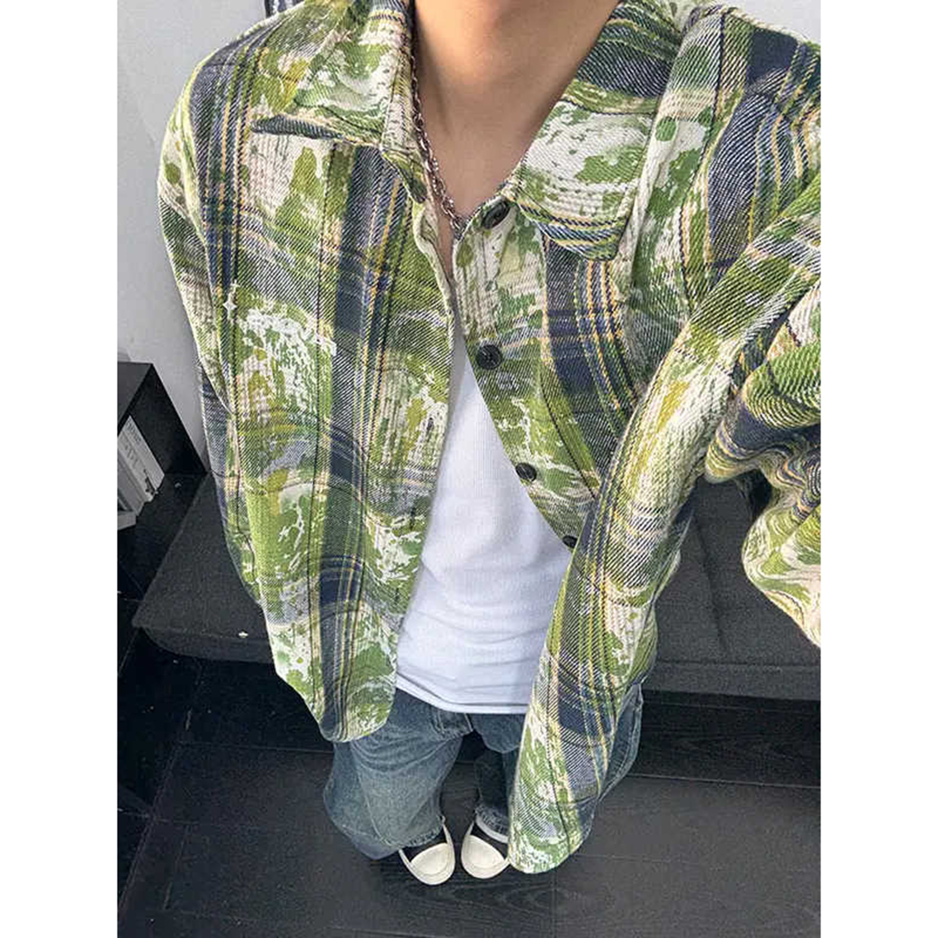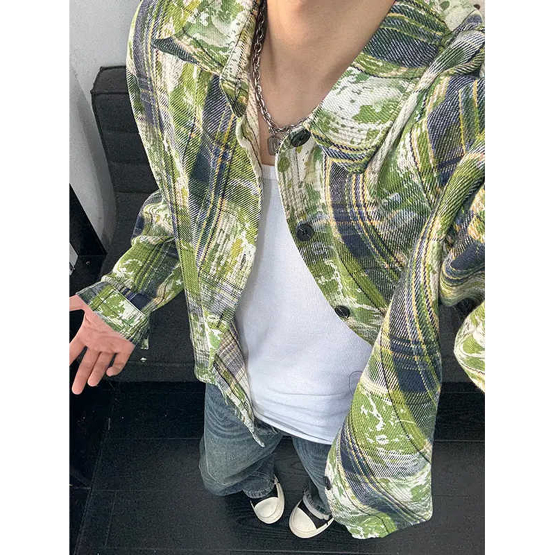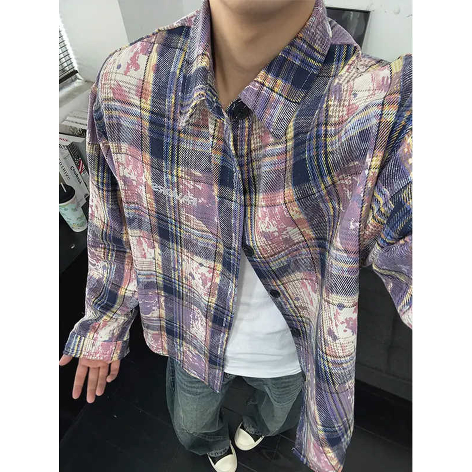 vintage扎染格子衬衫男款美式春夏长袖衬衣外套学院风叠穿上衣潮