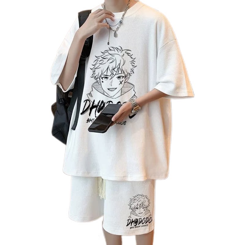 华夫格短袖T恤套装男夏季2026新款青少年薄款宽松休闲运动一整套