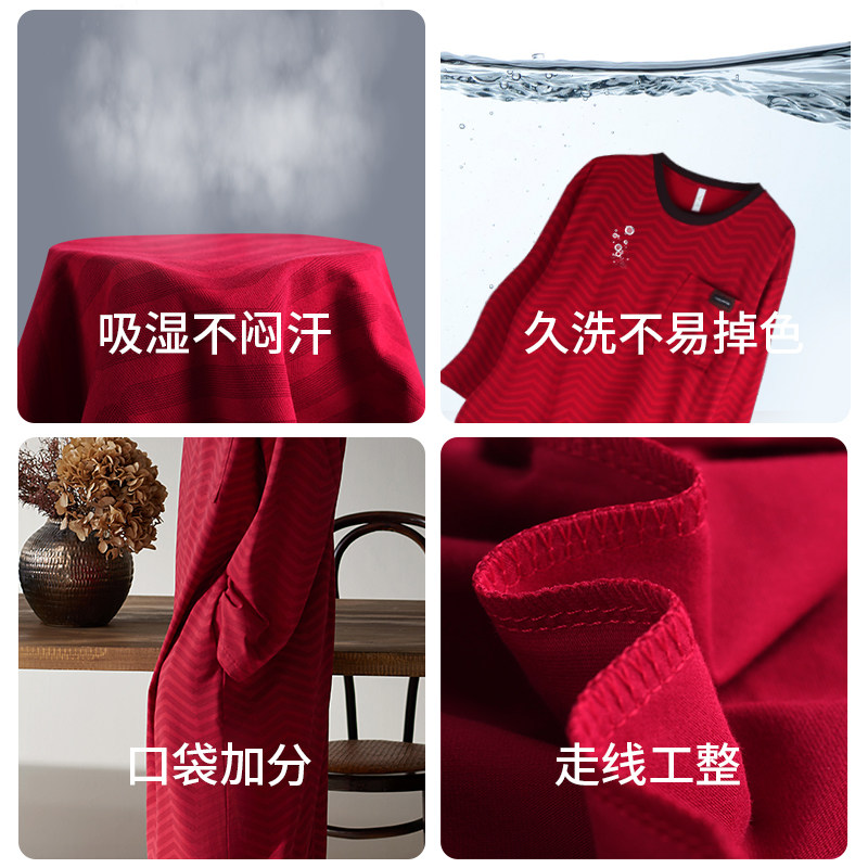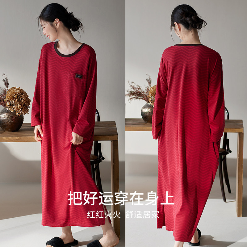 轩靓睡裙女春秋季纯棉长袖睡衣新款条纹大码红色本命年晨袍连衣裙