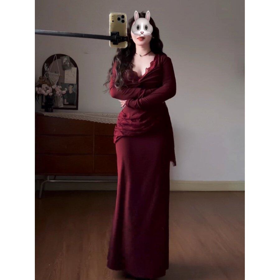 大码胖MM气质复古蕾丝拼接显瘦长袖连衣裙红色深V领修身长裙女装