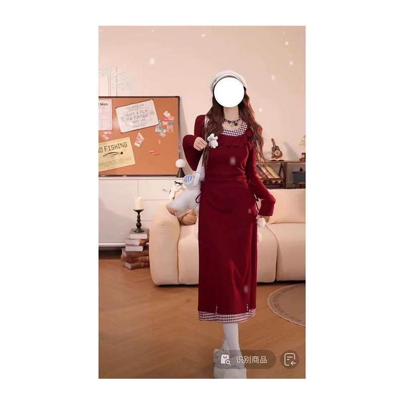辣妹圣诞红色格子荷叶连衣裙长袖针织冬季新款收腰显瘦短裙裙子
