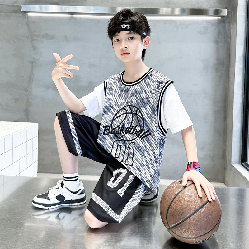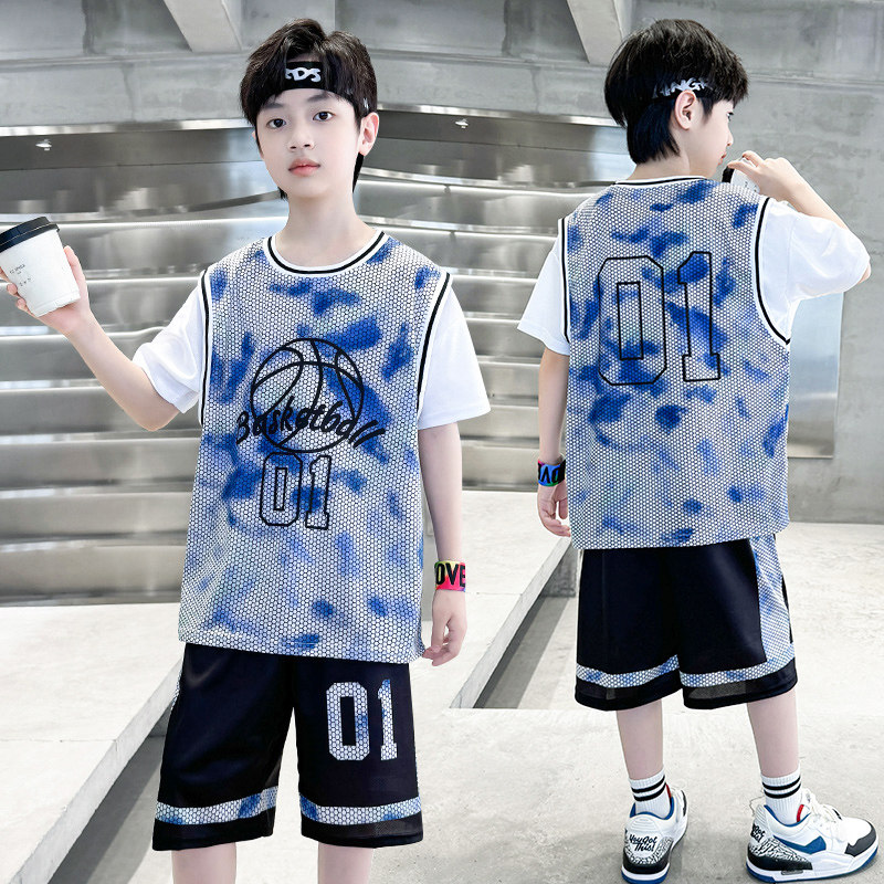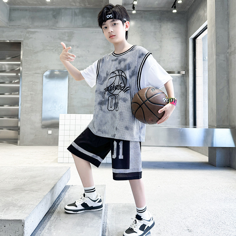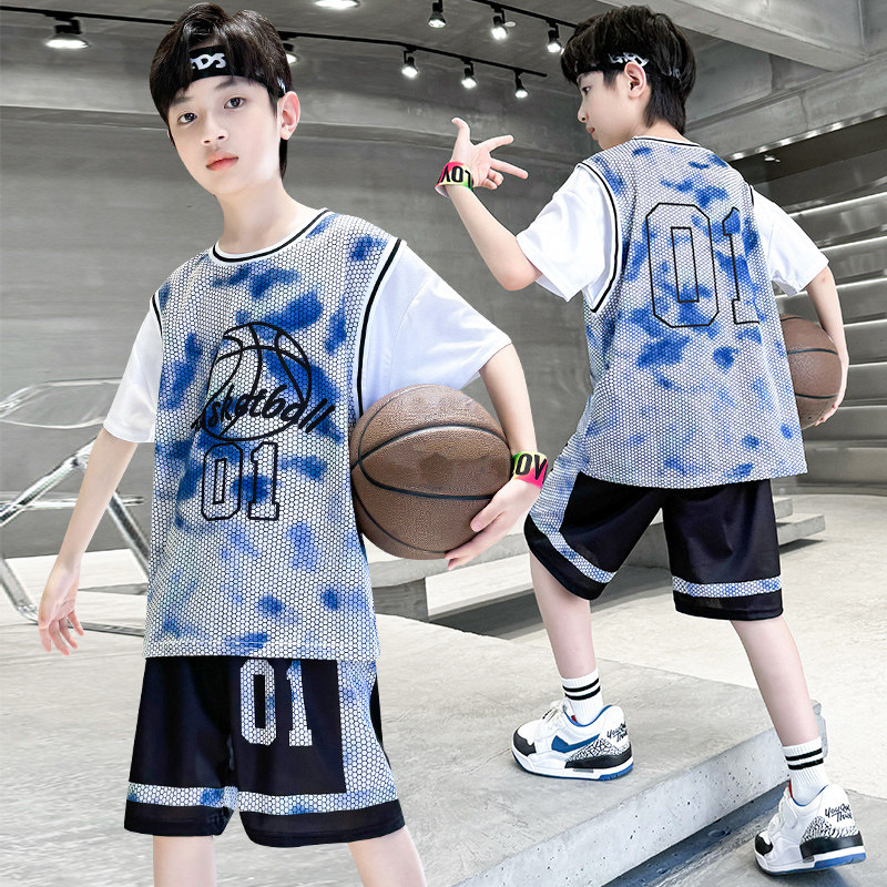 儿童1号篮球服短袖套装男童速干训练服球衣男孩运动假两件球衣夏