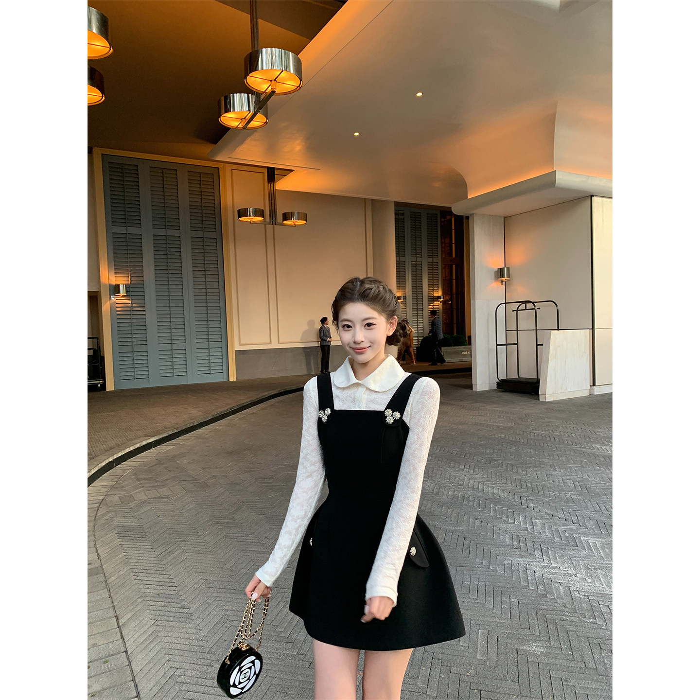 SourceWithU 璀璨千金 钻石扣公主收腰短款连衣裙黑色a字背带裙女