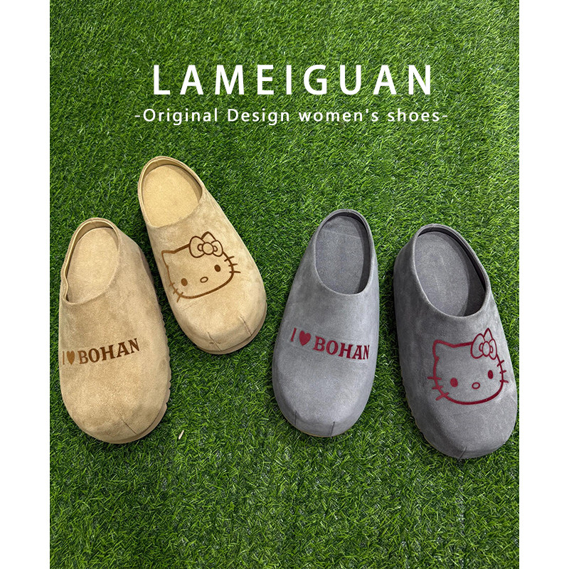 牛皮版!卡其色增高6cm厚底包头半拖鞋女外穿2025新款真皮勃肯鞋