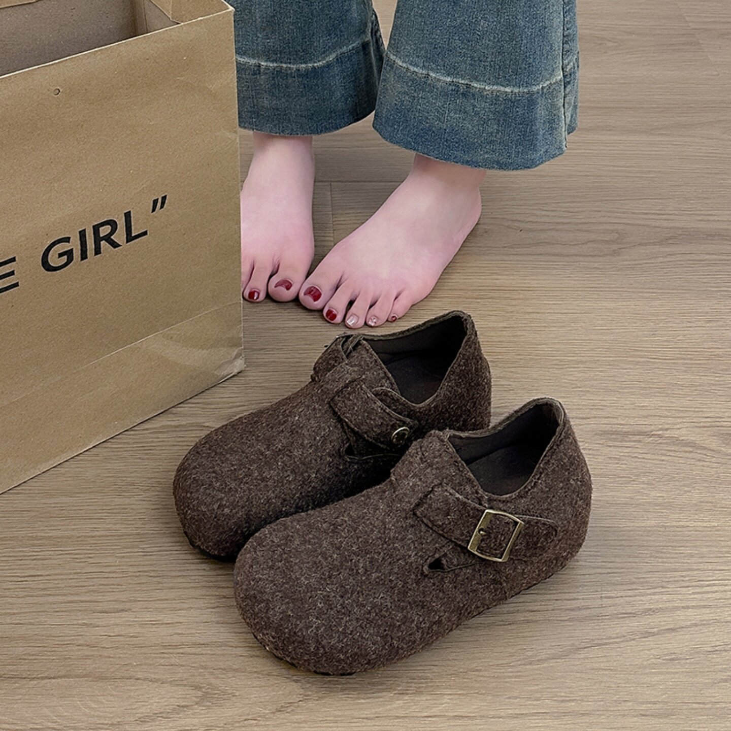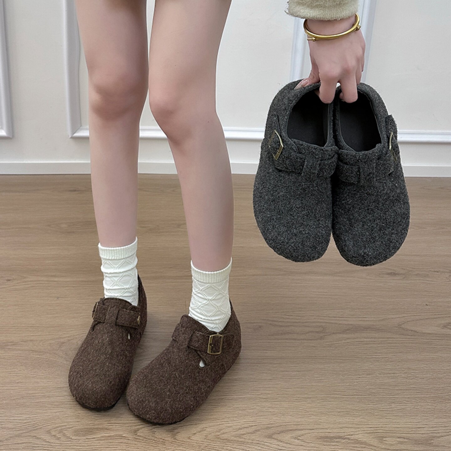 厚底内增高5cm勃肯鞋女2026春季新款一脚蹬乐福鞋子灰色毛呢单鞋