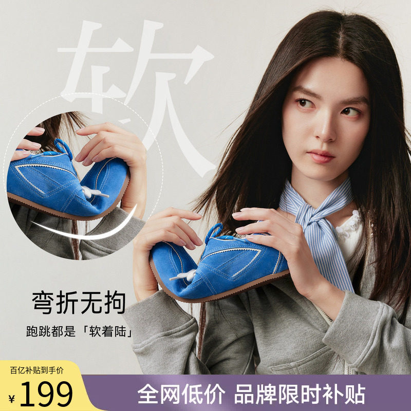 百思图春秋新款真皮红色德训鞋内增高运动休闲鞋女赛车鞋D3250CM5