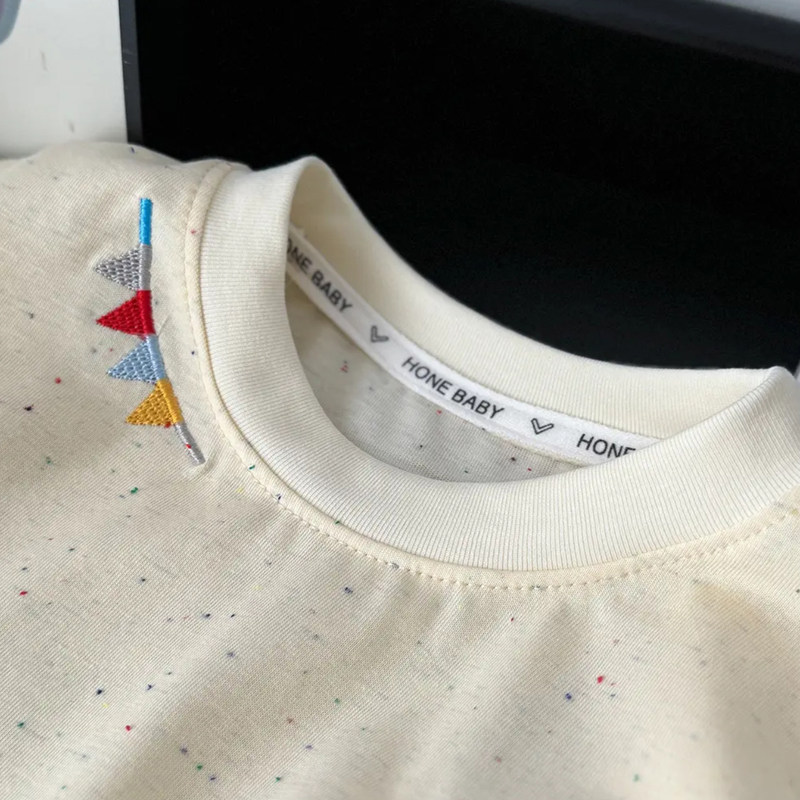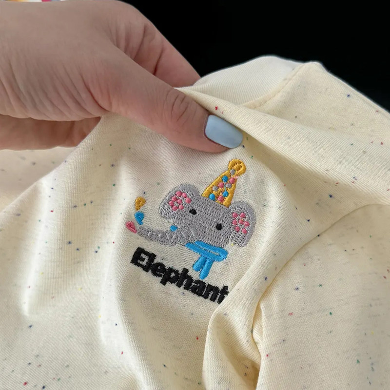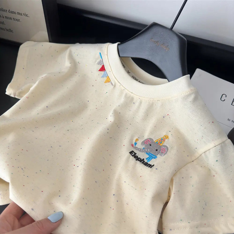 儿童短袖T恤纯棉圆领刺绣米杏色夏季男女童宝宝薄款多巴胺上衣服t