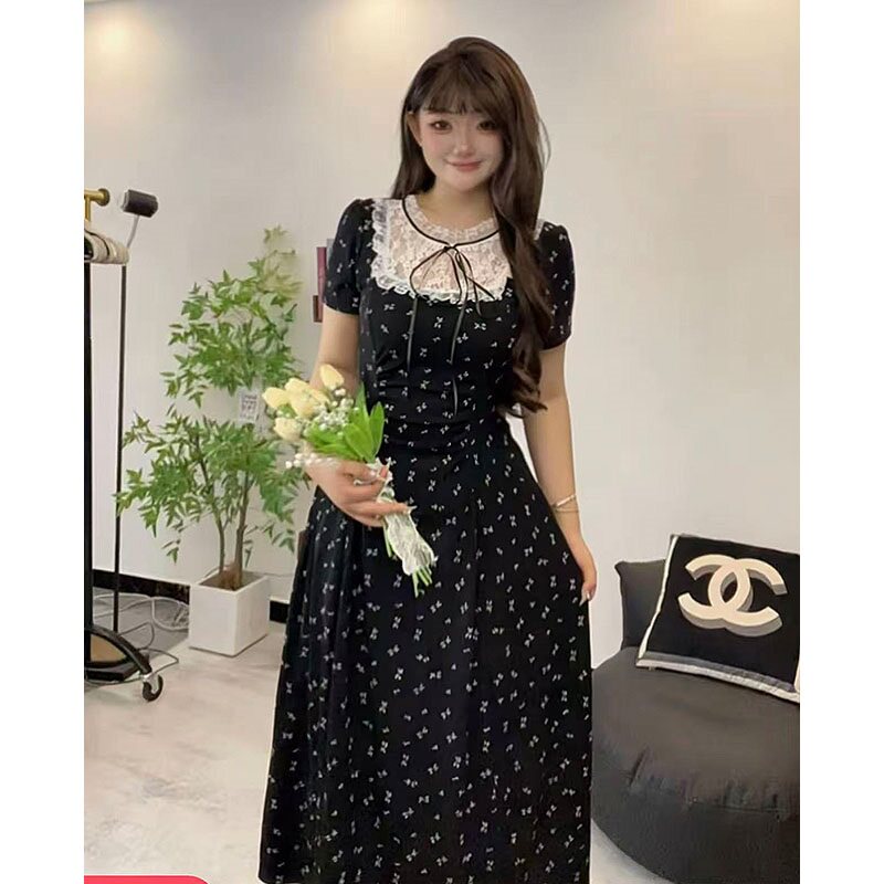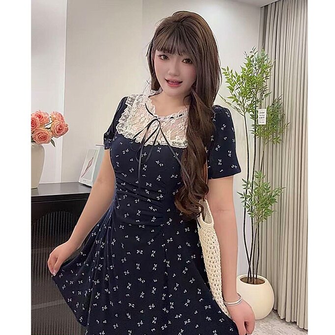 大码胖mm法式甜美蕾丝拼接收腰碎花连衣裙女春夏气质显瘦中长裙子