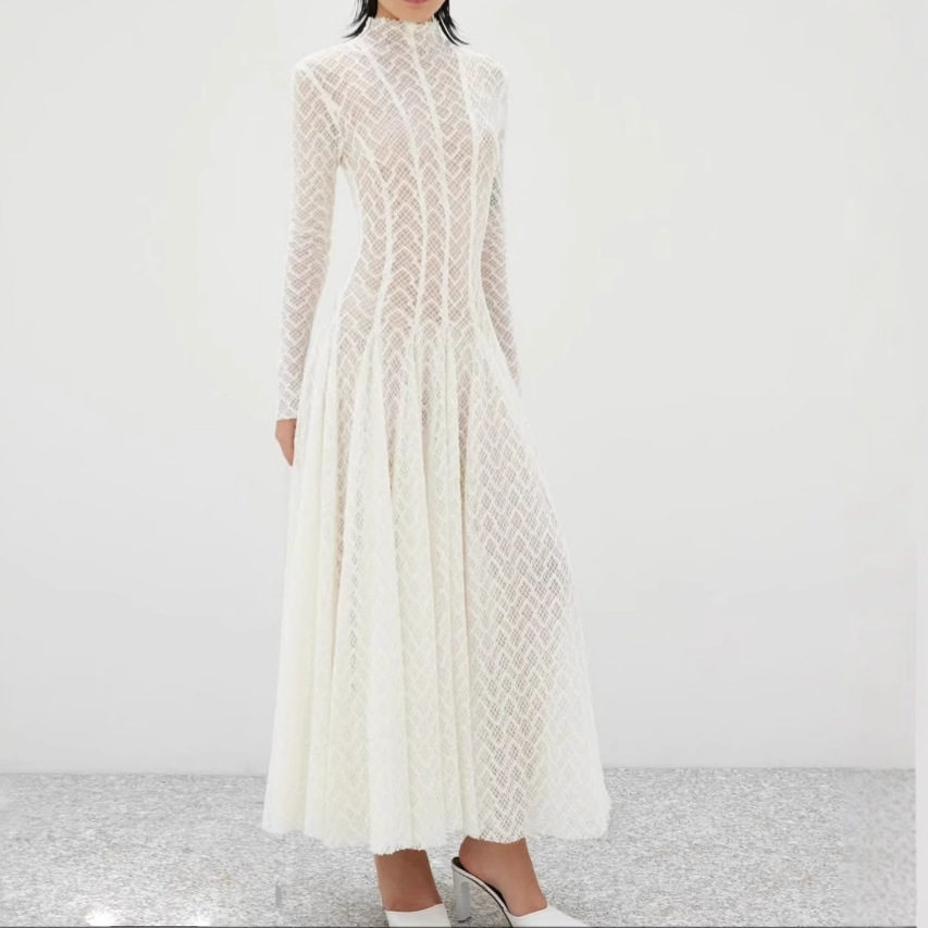 2025早春长袖修身大摆伞裙名媛气质蕾丝透视长袖连衣裙长款1950