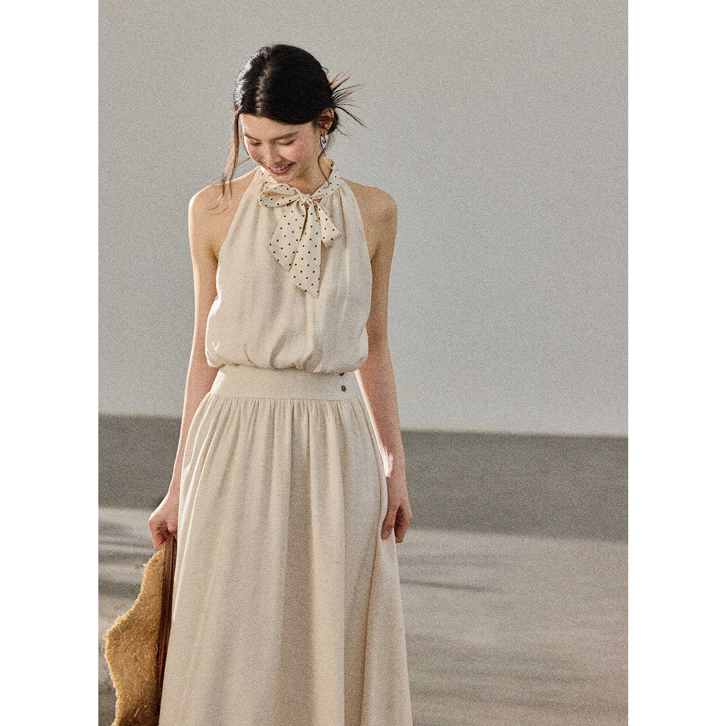 贰羊设计【晚晴】日常通勤挂脖系带背心裙女夏收腰无袖系带连衣裙