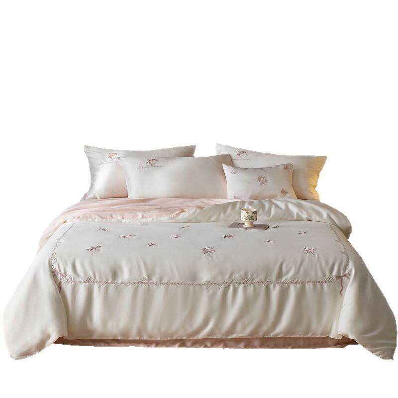 粉色少女心60支兰精天丝四件套轻奢花卉刺绣凉感冰丝床上三件套夏