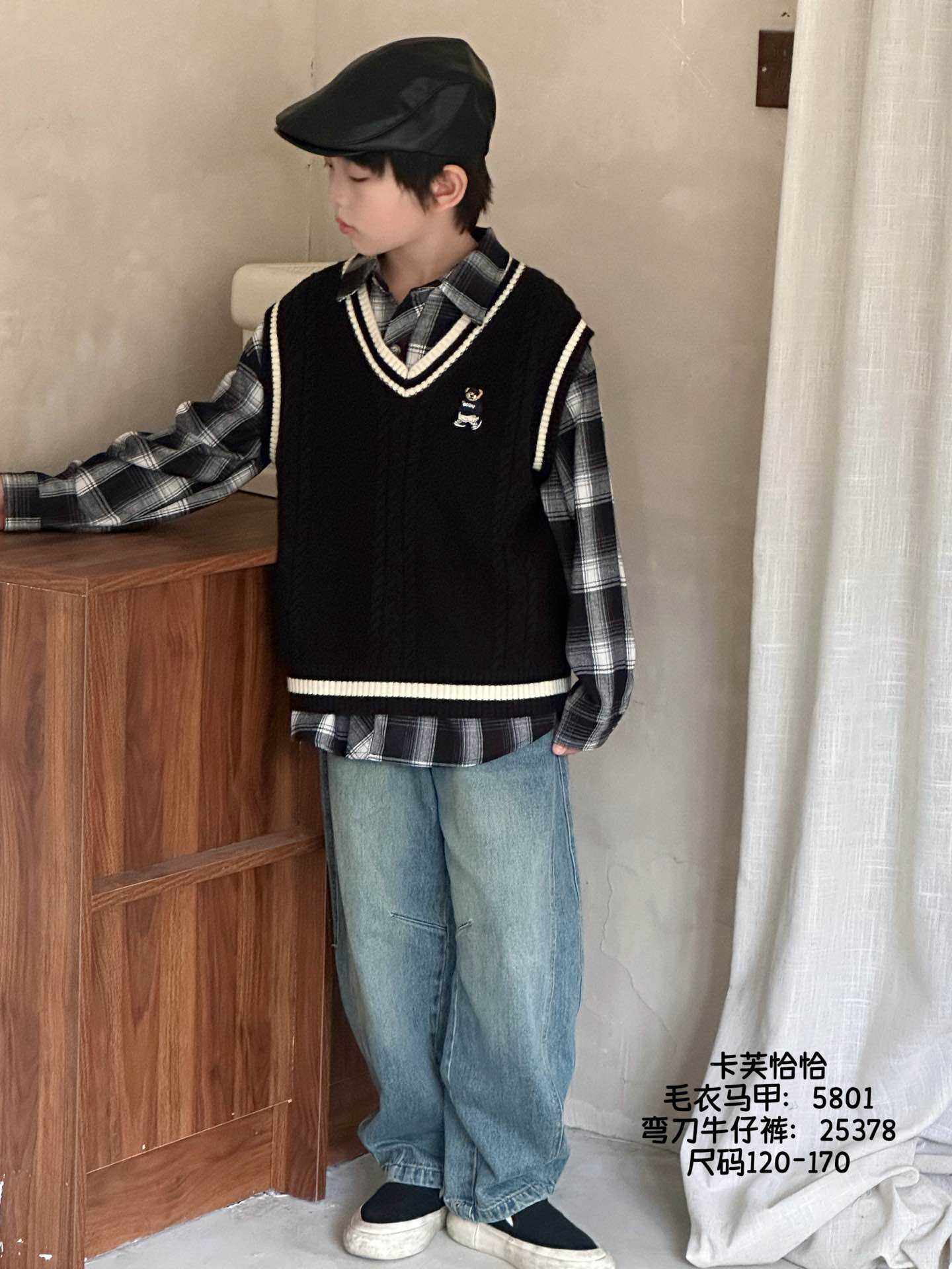 卡芙恰恰25秋装新品男女童学院风针织马甲V刺绣小熊毛衣背心5801