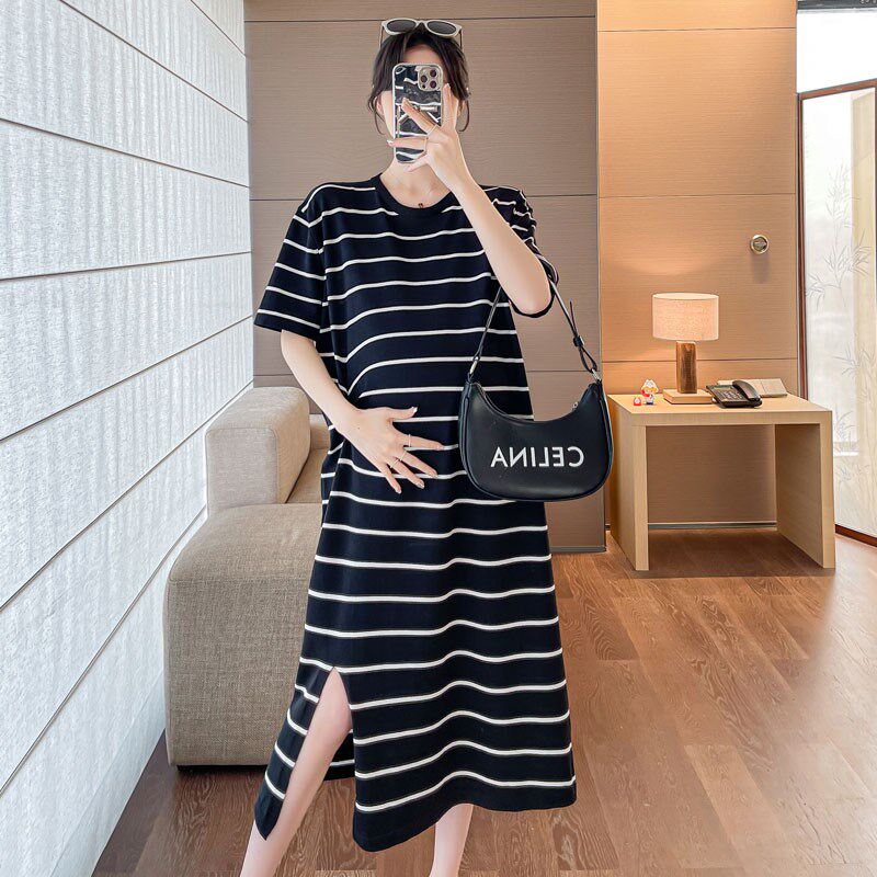 大码孕妇连衣裙夏季韩版设计感时尚开叉显瘦过膝中长款条纹200斤