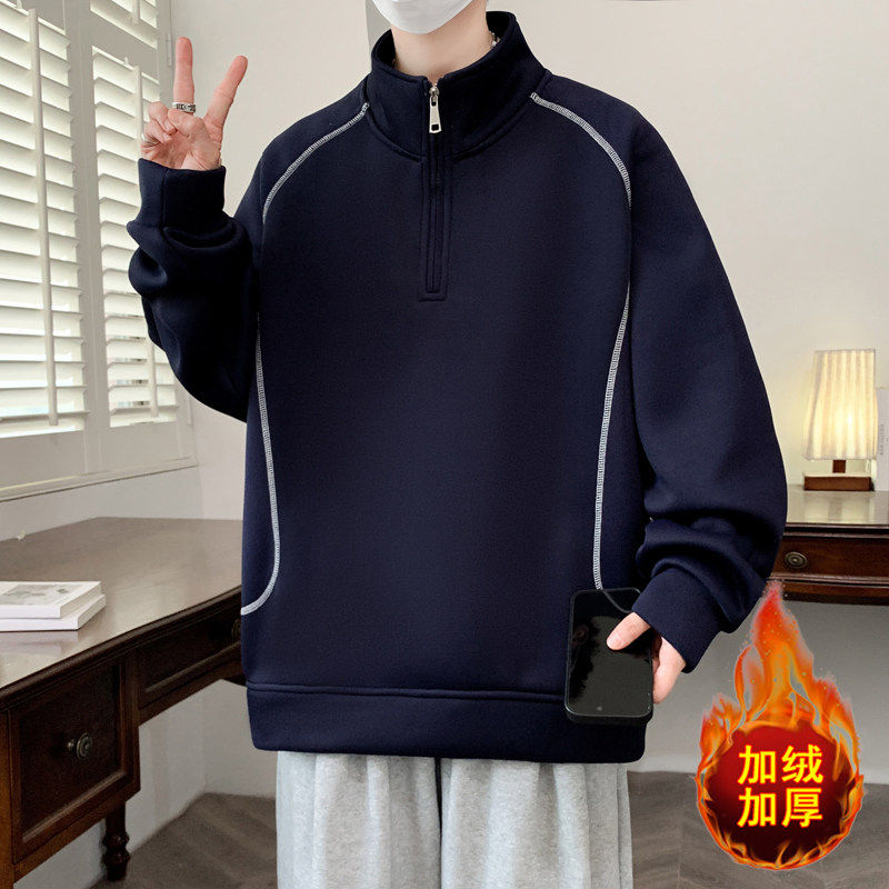 半高领加绒卫衣男款秋冬季宽松上衣青少年加厚保暖半拉链打底衫潮