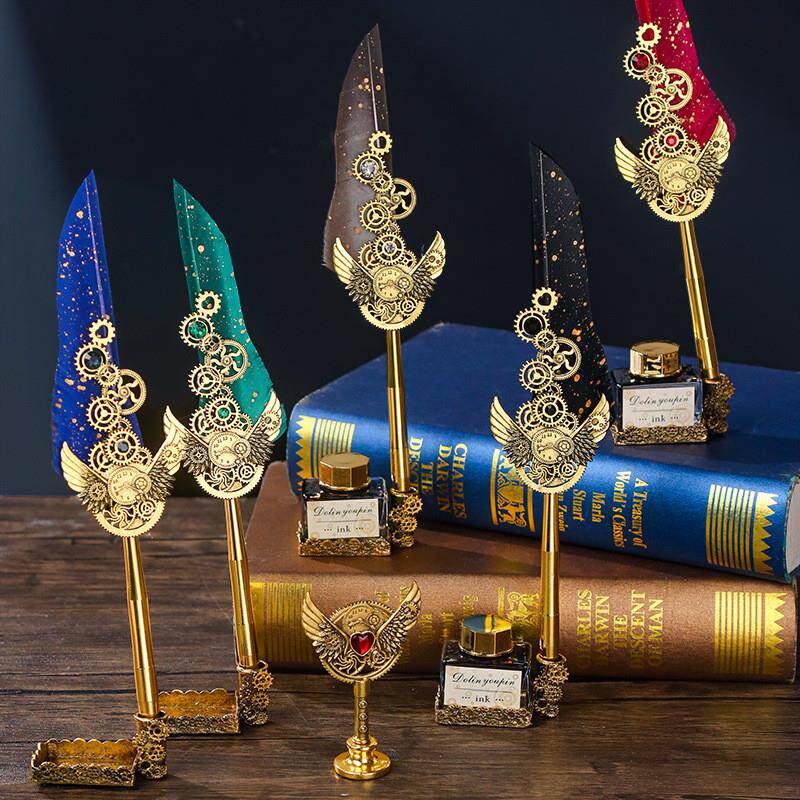 欧式复古笔记本子礼盒牛皮纸内页文艺古风记事本机械洒金羽毛钢笔
