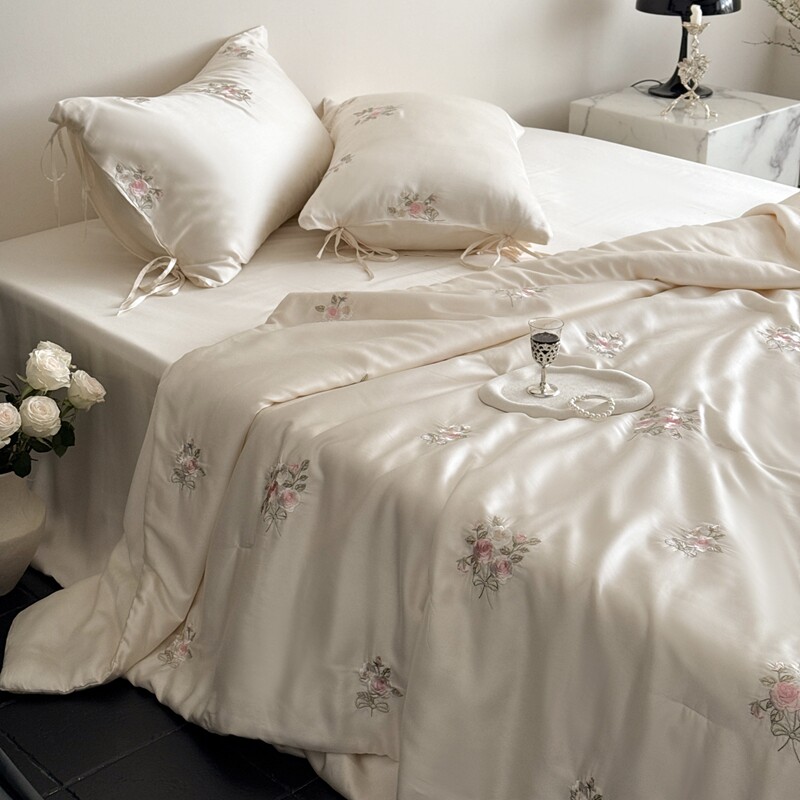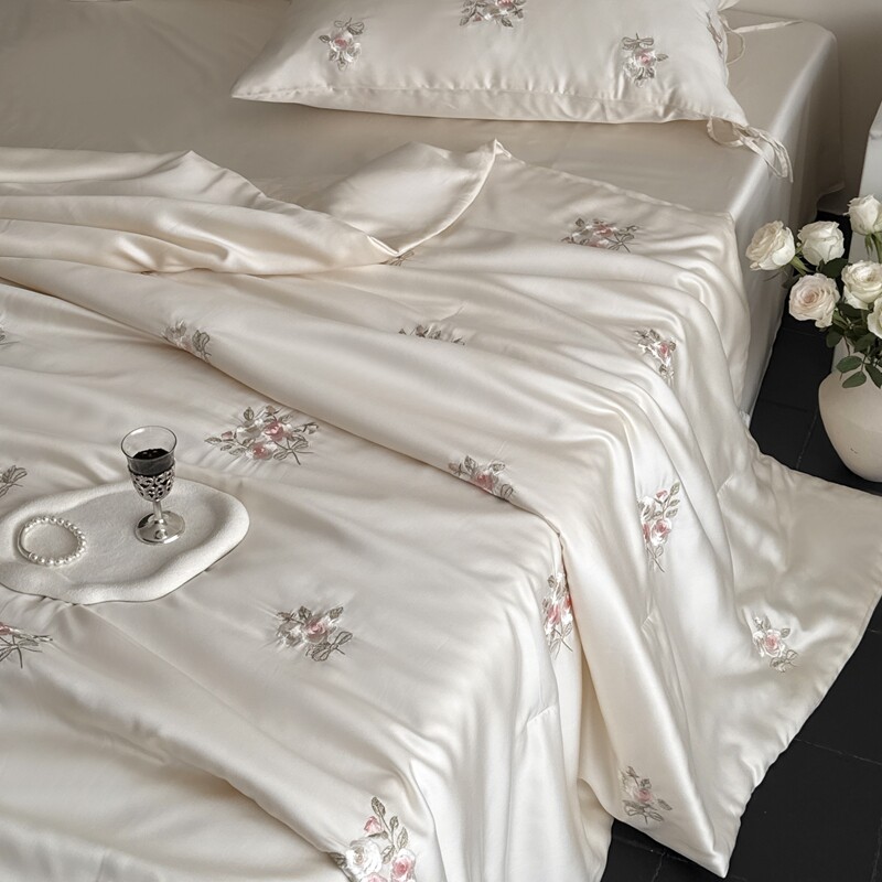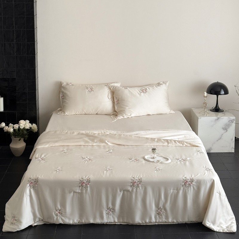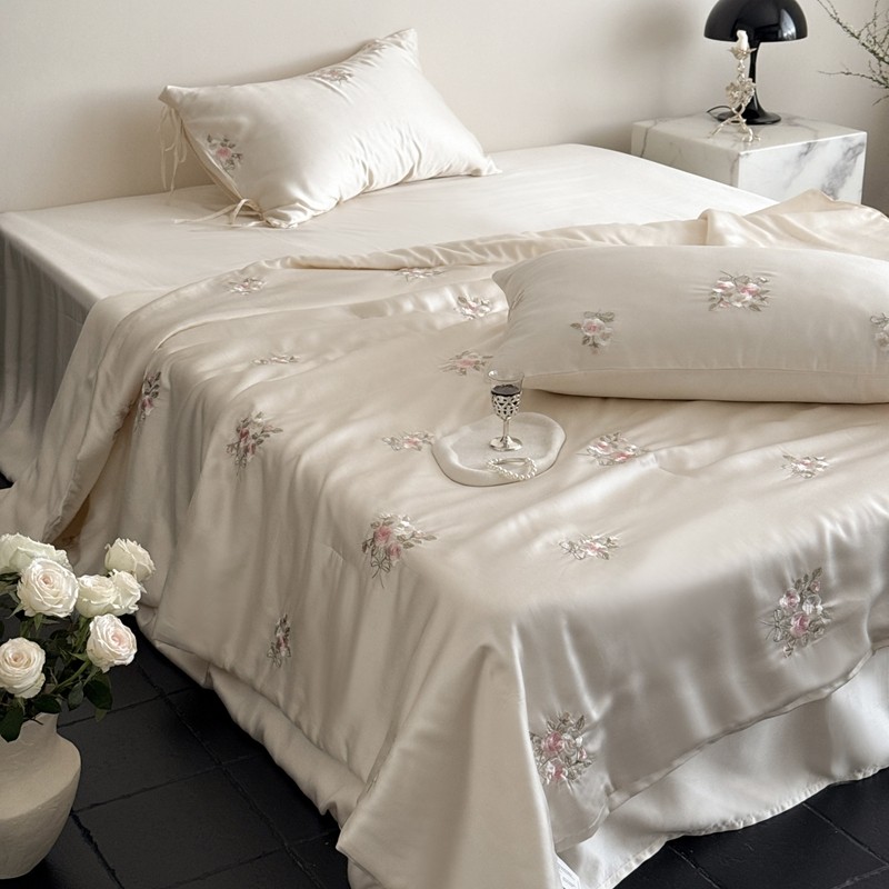 奶油色!兰精天丝夏凉被四件套 轻奢高级感重工刺绣空调被薄被子