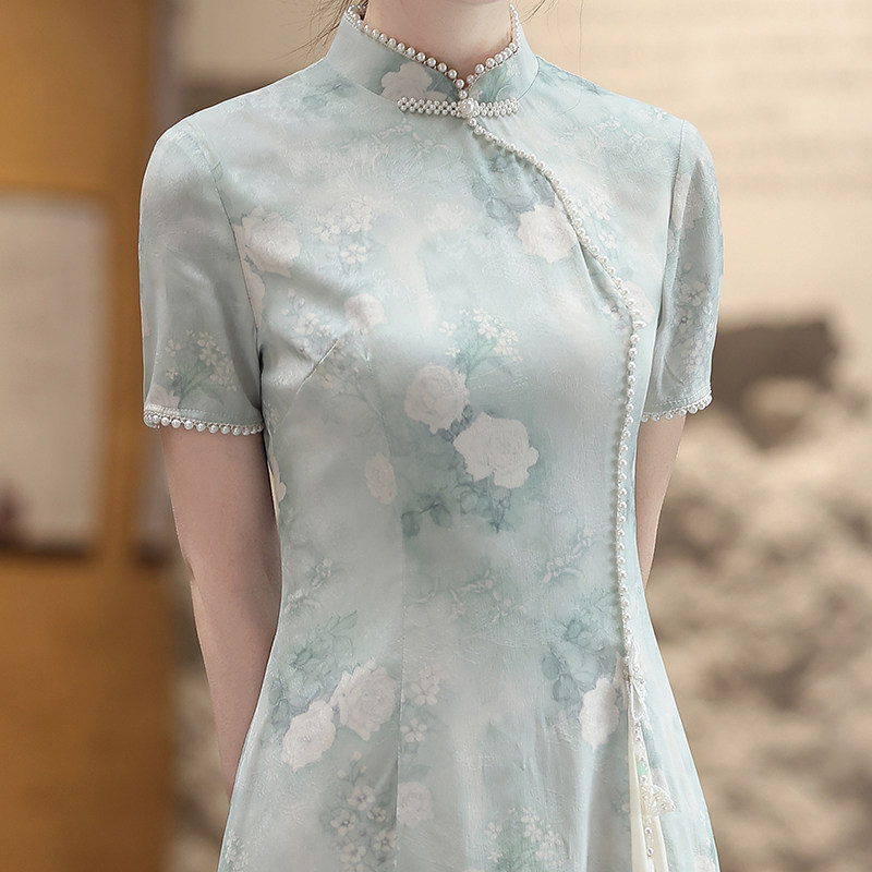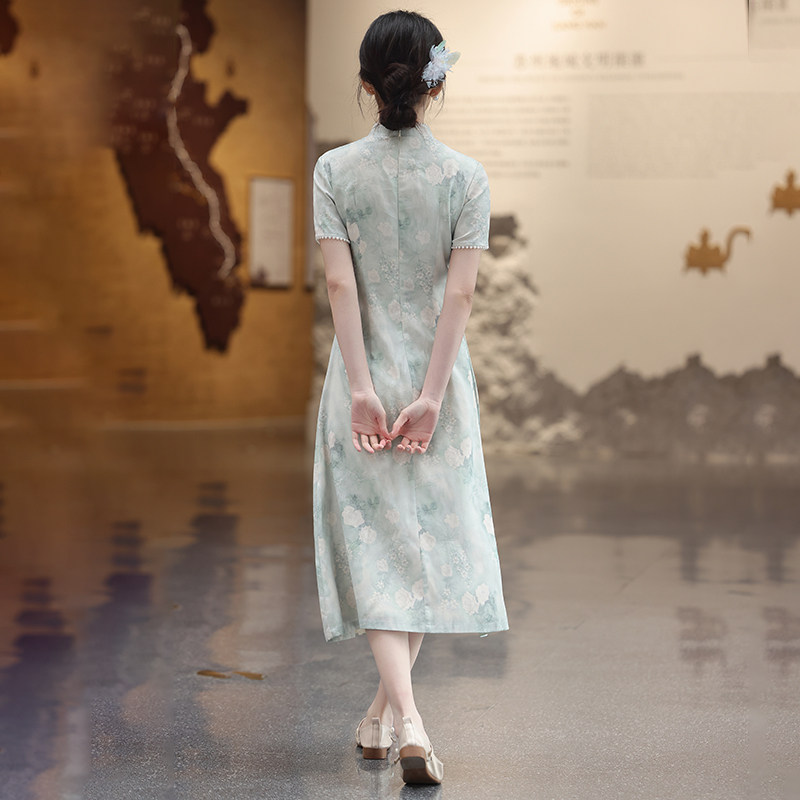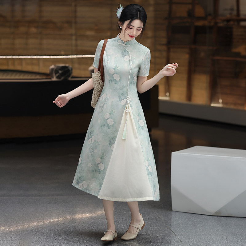 新中式浅绿色旗袍连衣裙女夏季高级感修身显瘦系带日常中长裙短袖