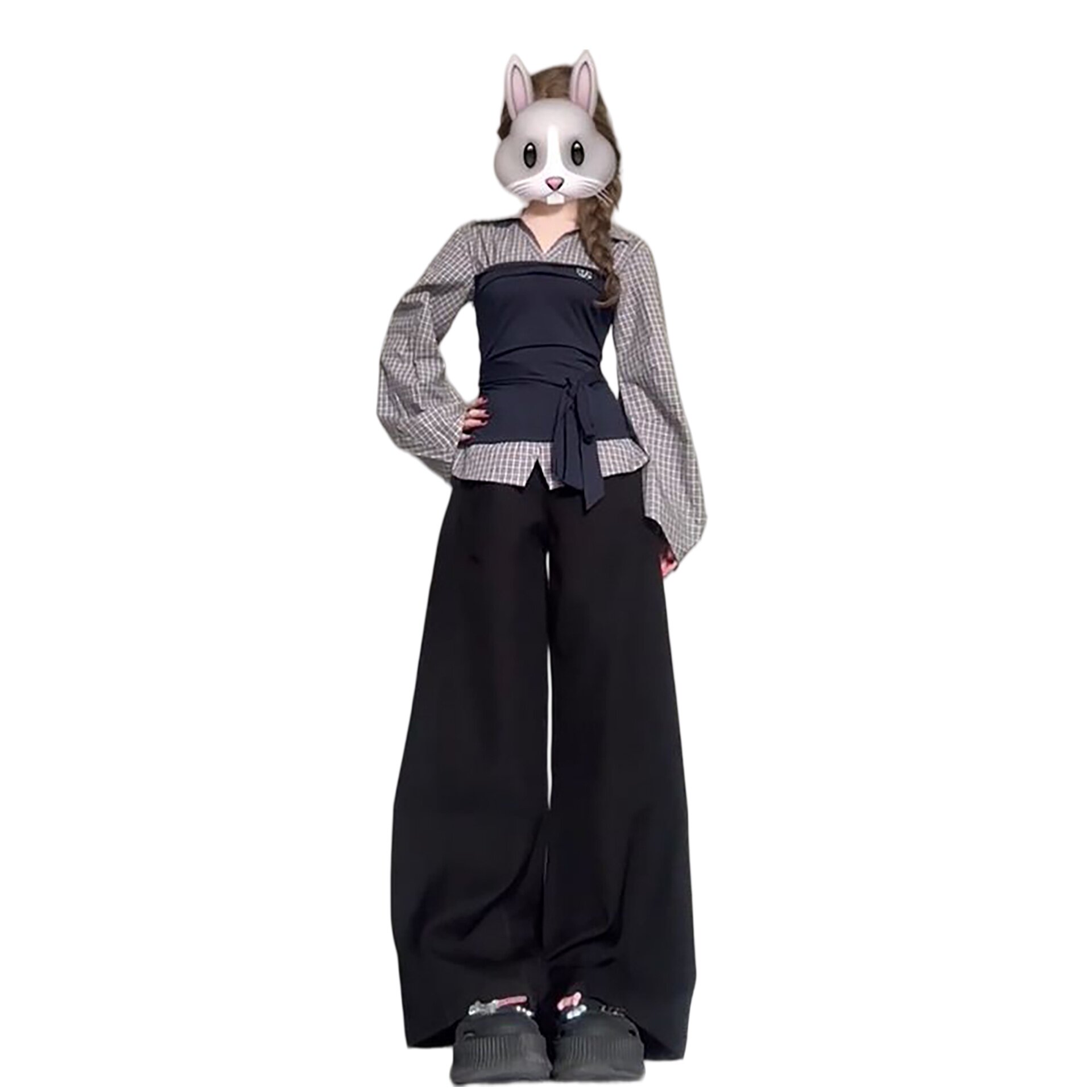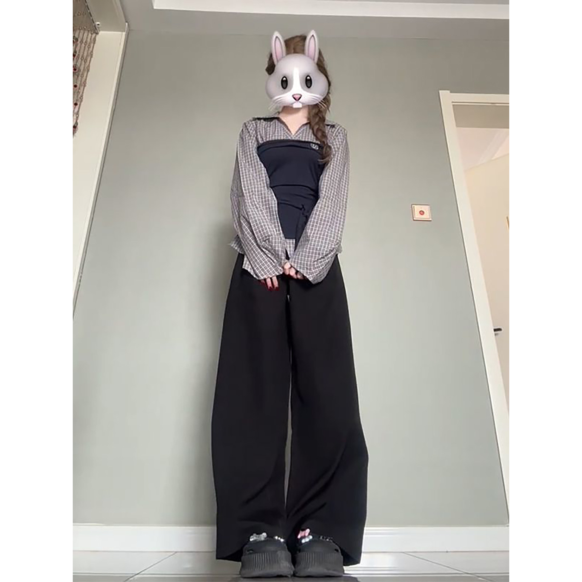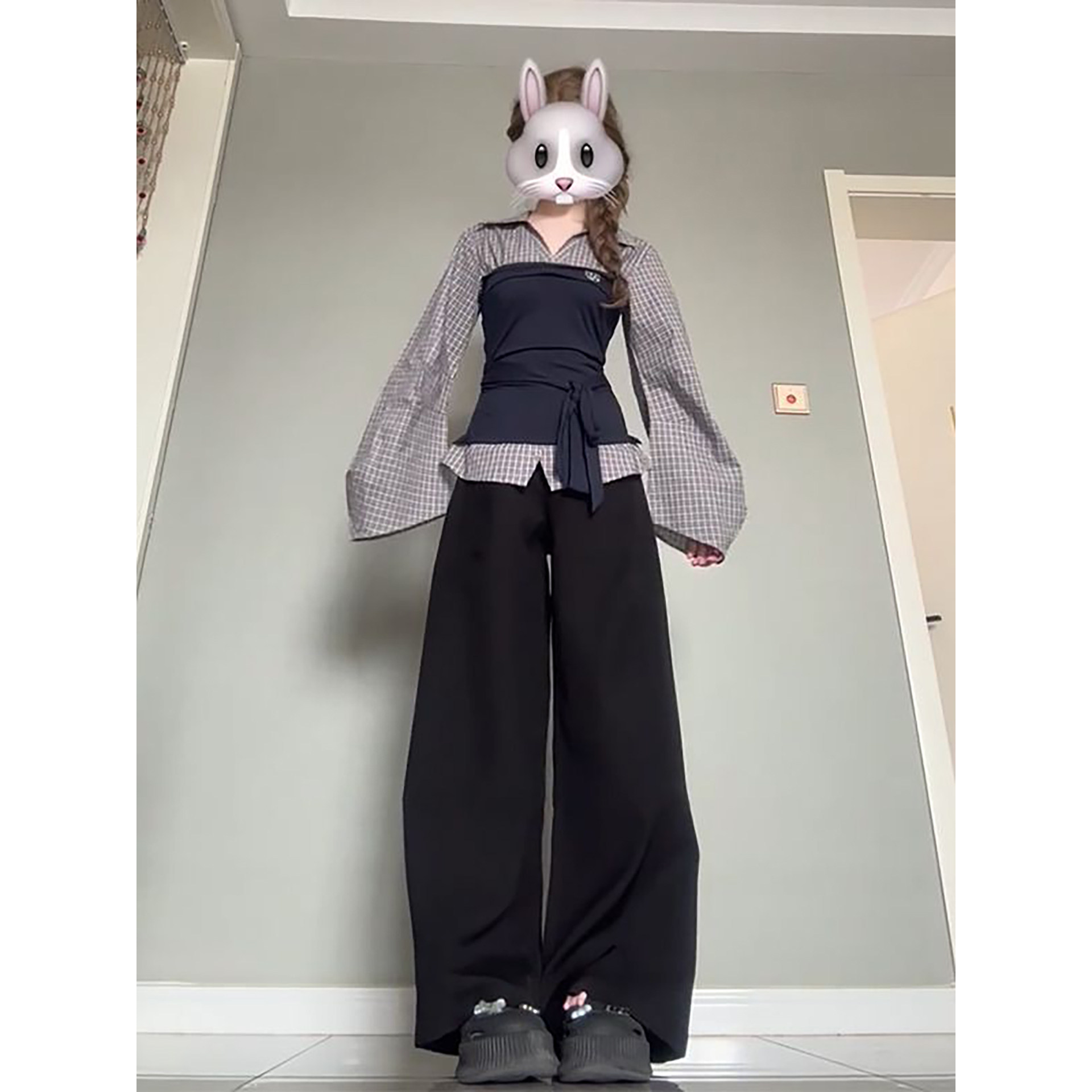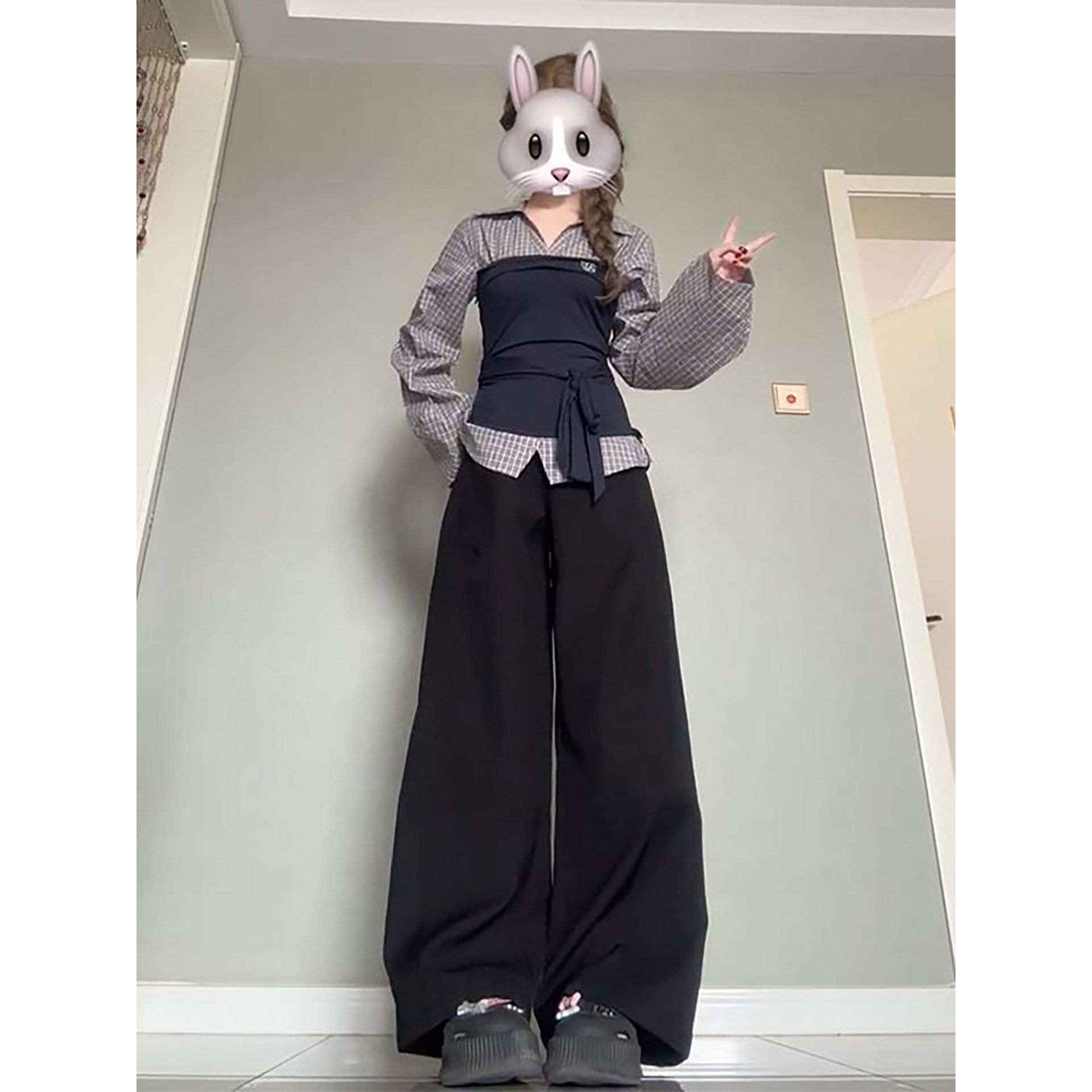 2026早春新款复古小个子穿搭格纹拼接衬衫女搭配黑色休闲阔腿长裤