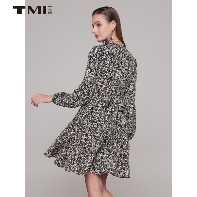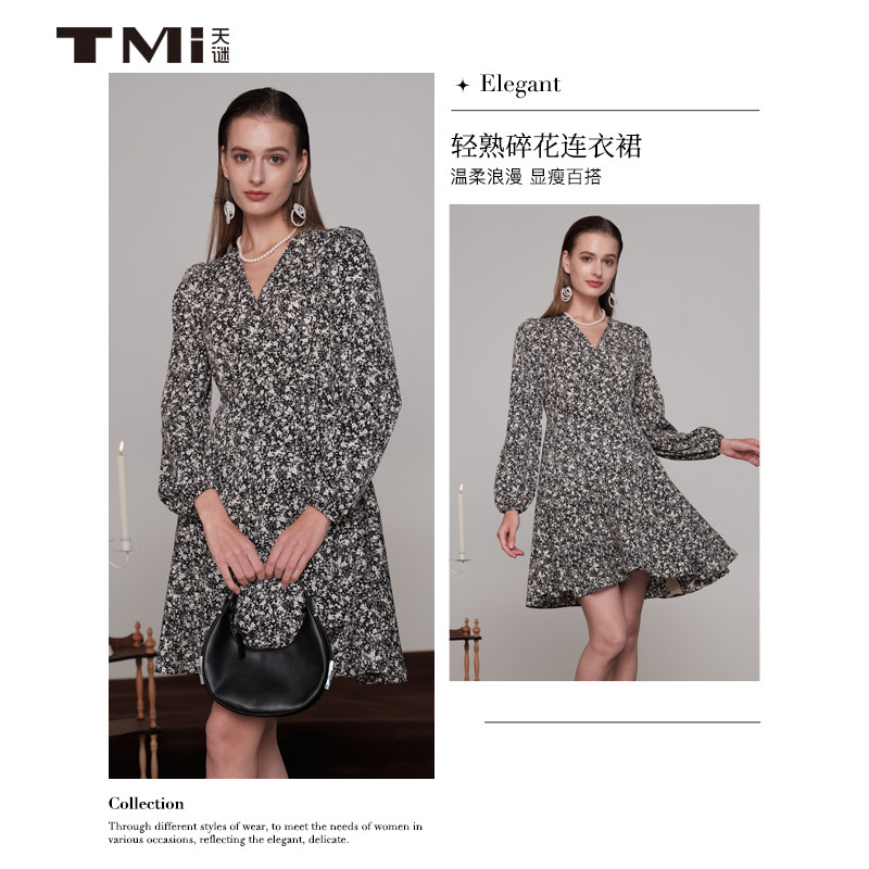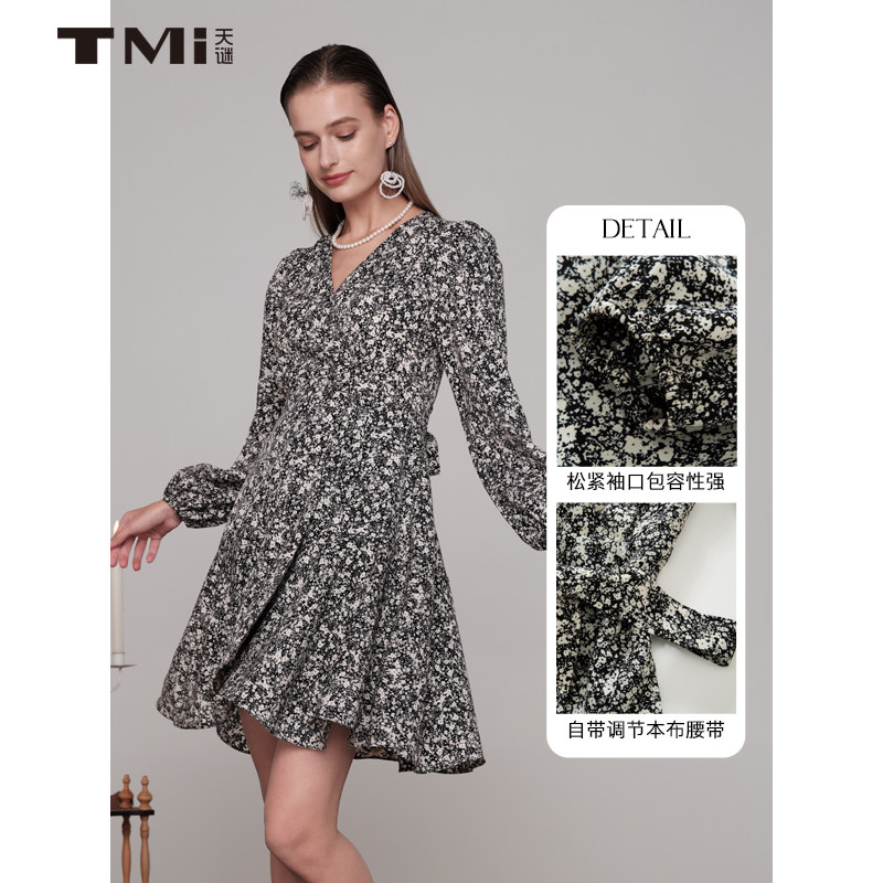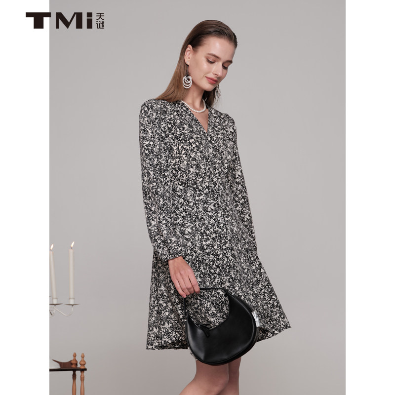 天谜连衣裙V领长袖碎花法式百褶时尚中长裙2024春季女装TMi241141