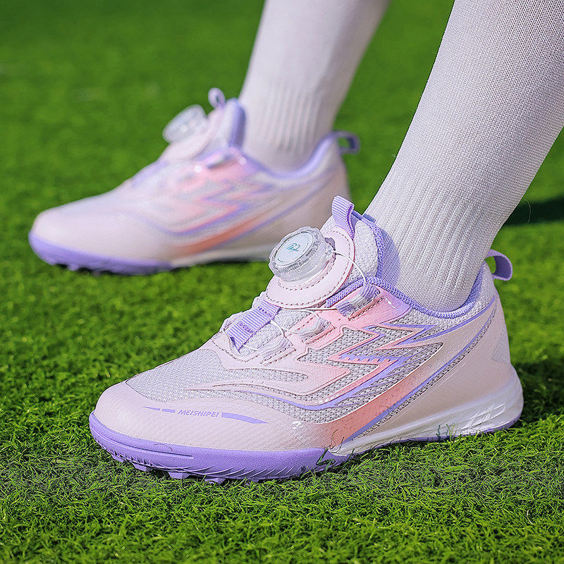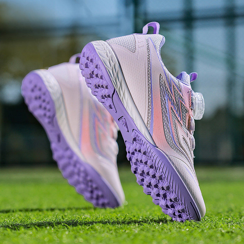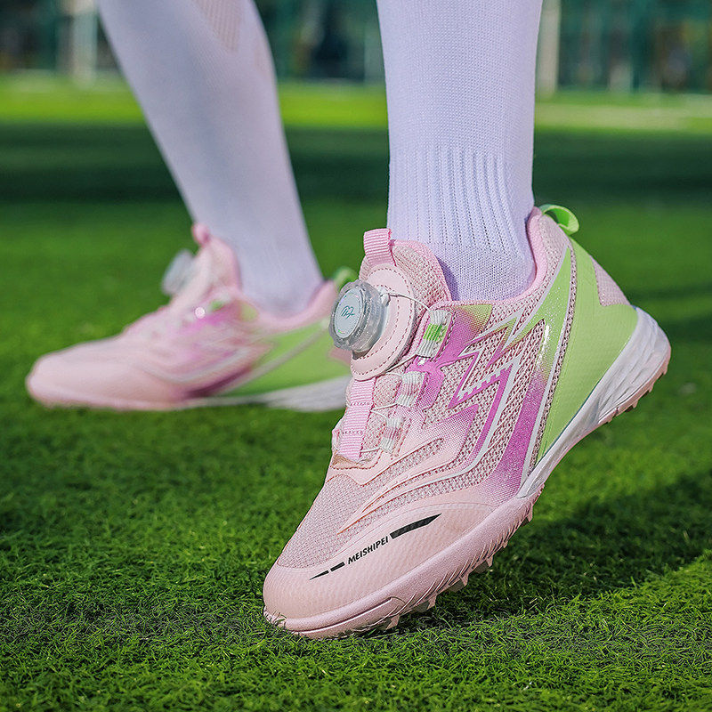 女童足球鞋网面透气旋转纽扣初学儿童专用碎钉训练鞋免系鞋带球鞋