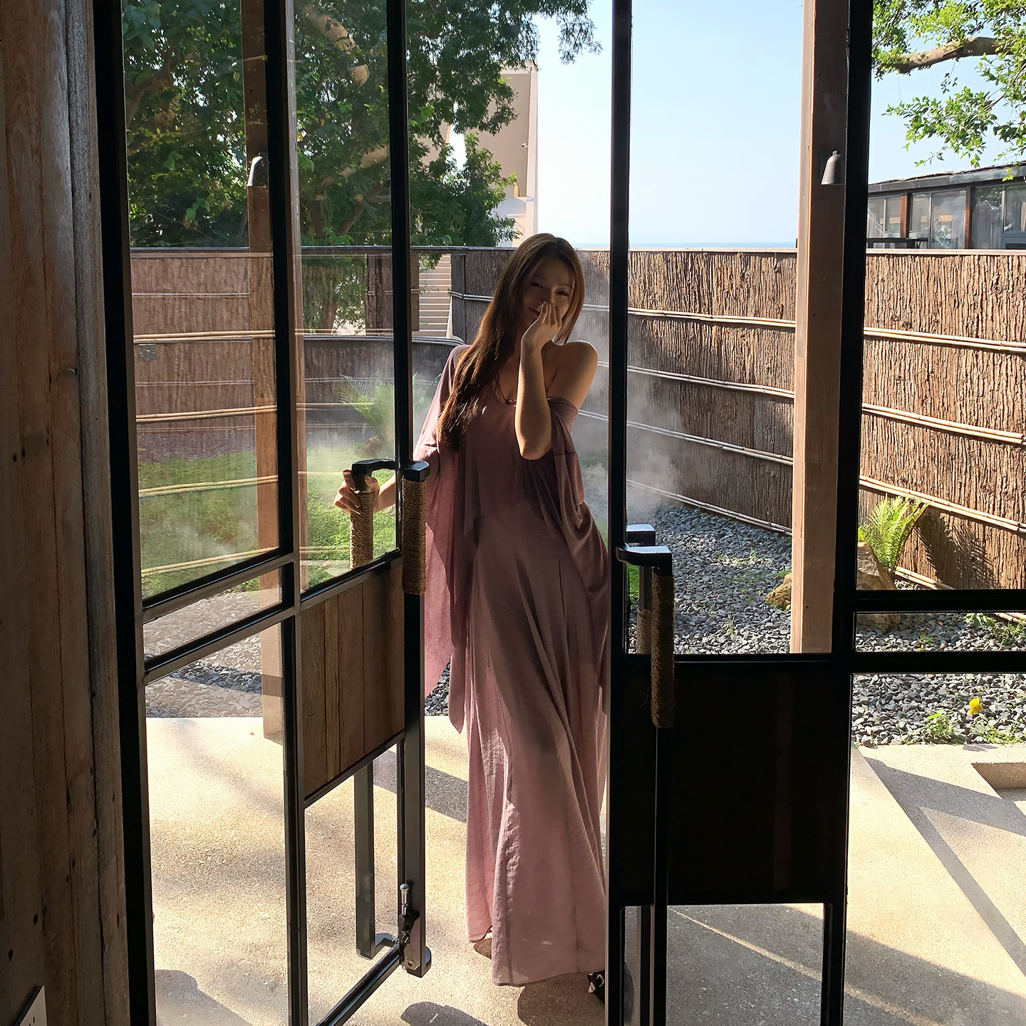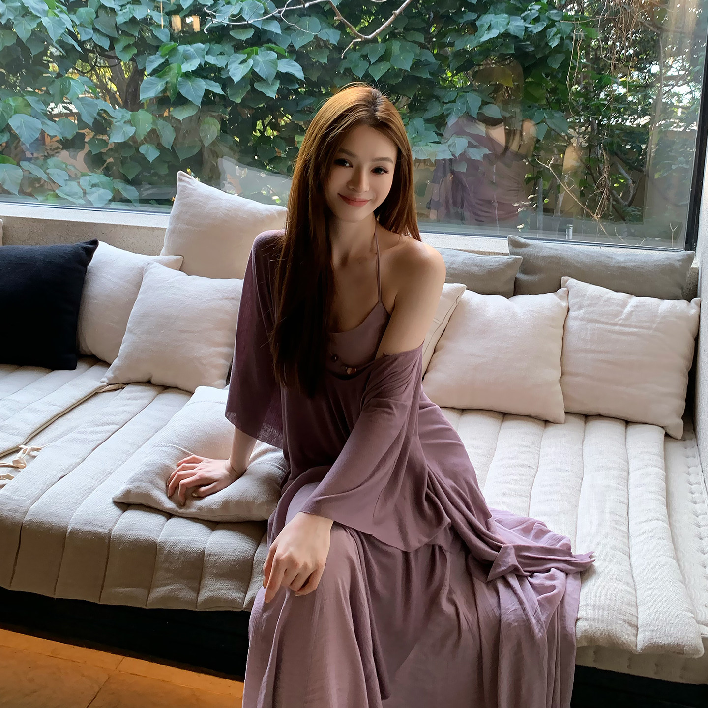Lienni2025冬季新款气质收腰显瘦侘寂烟紫长款无袖挂脖连衣裙女
