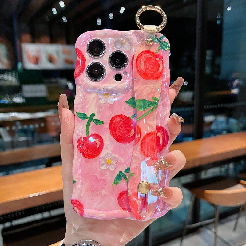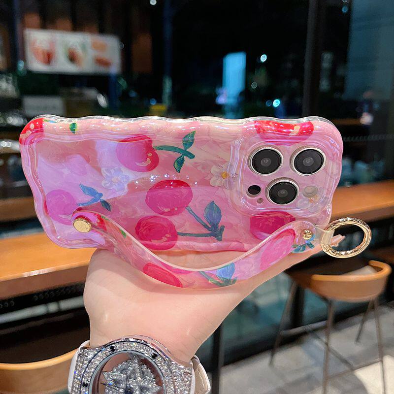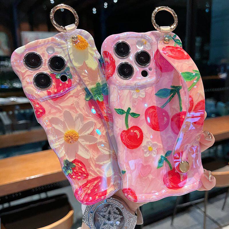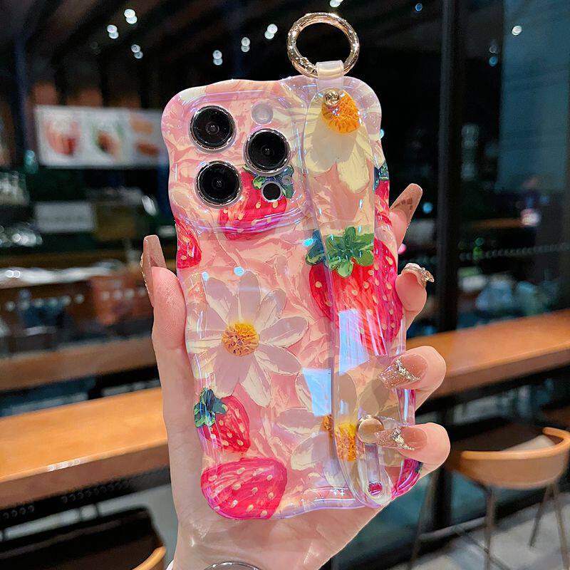 适用苹果系列iPhone16新款手机壳15pro14promax时尚个性草莓13pro16promax精孔透气扭扭边腕带支架保护套