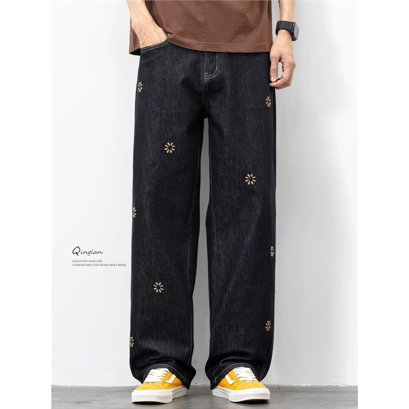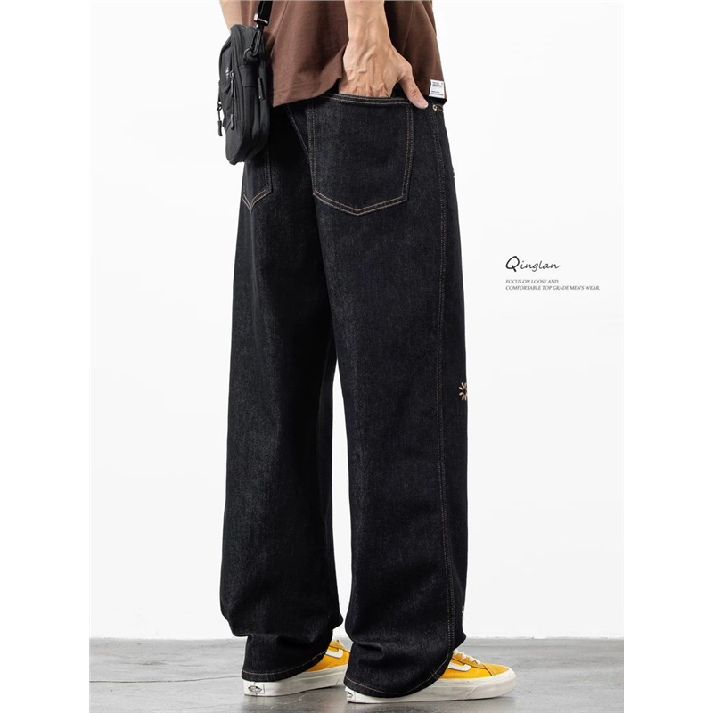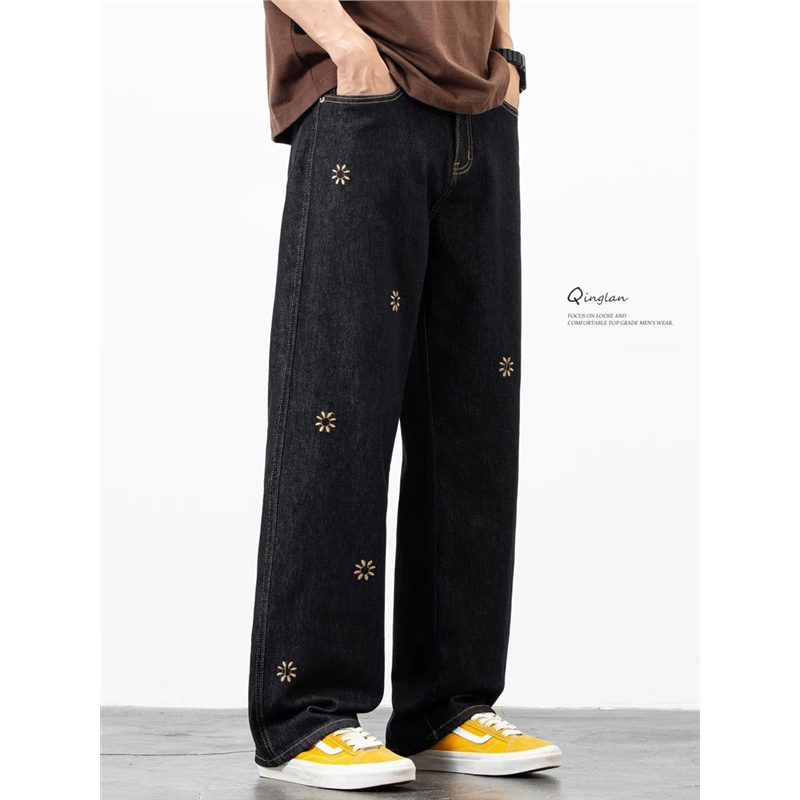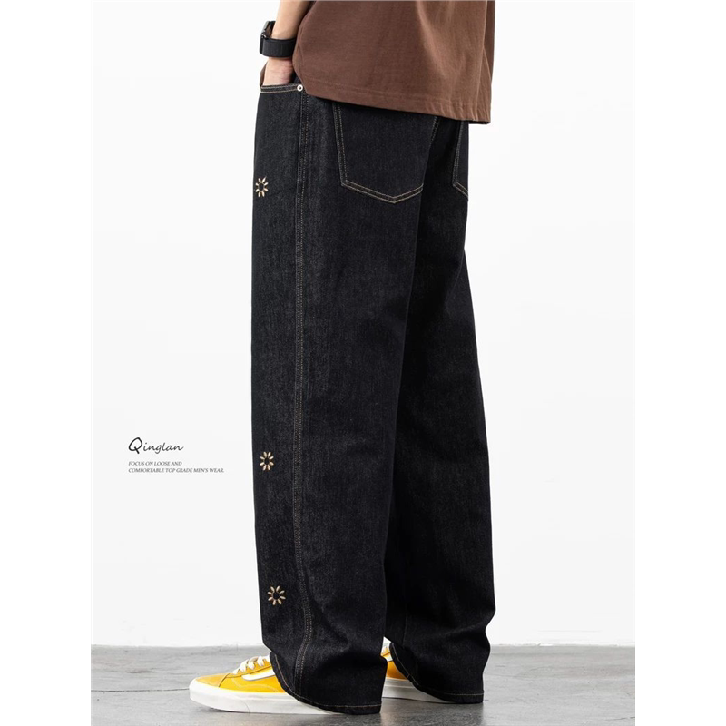黑色刺绣牛仔裤男直筒宽松阔腿垂感潮流休闲大码2026春季新款裤子