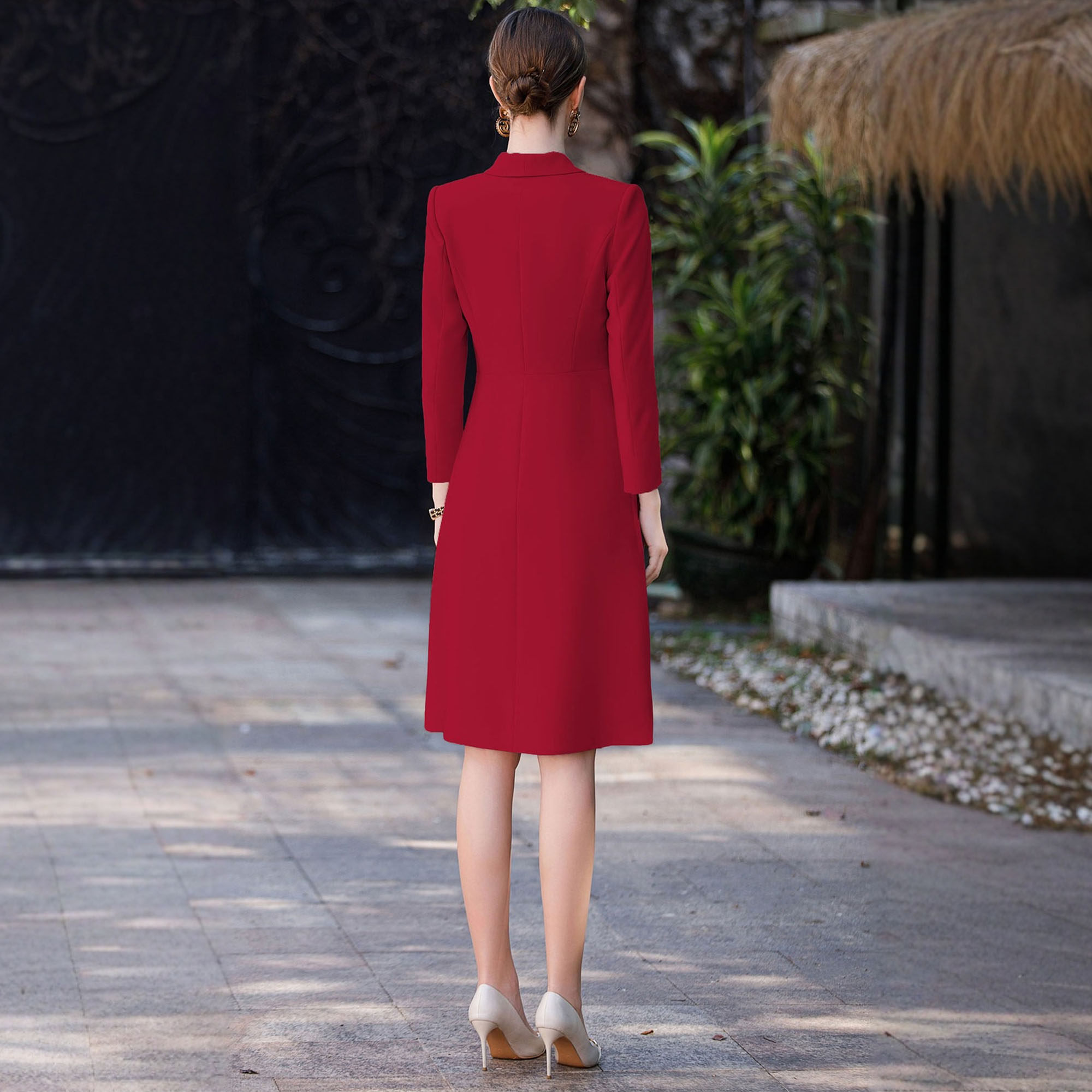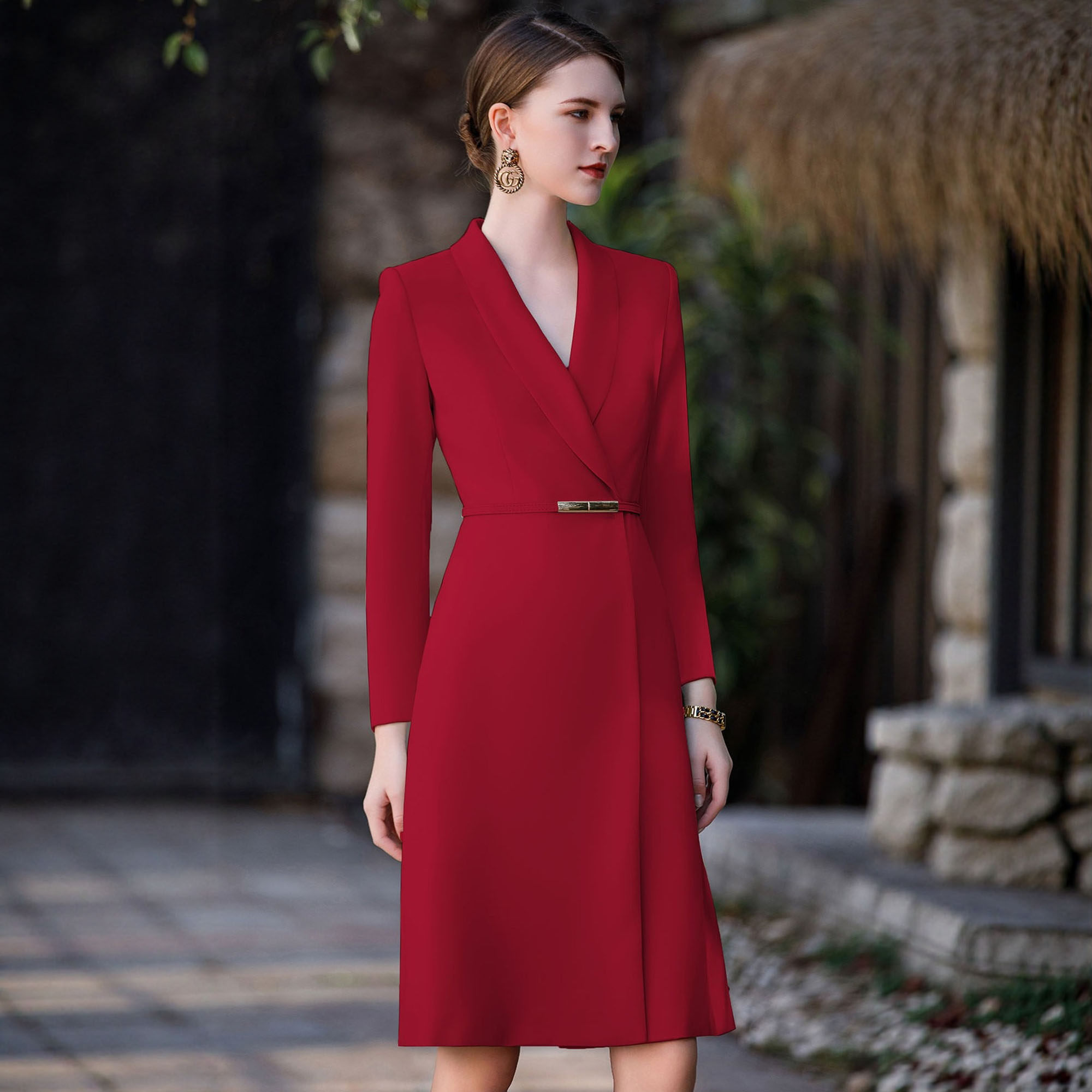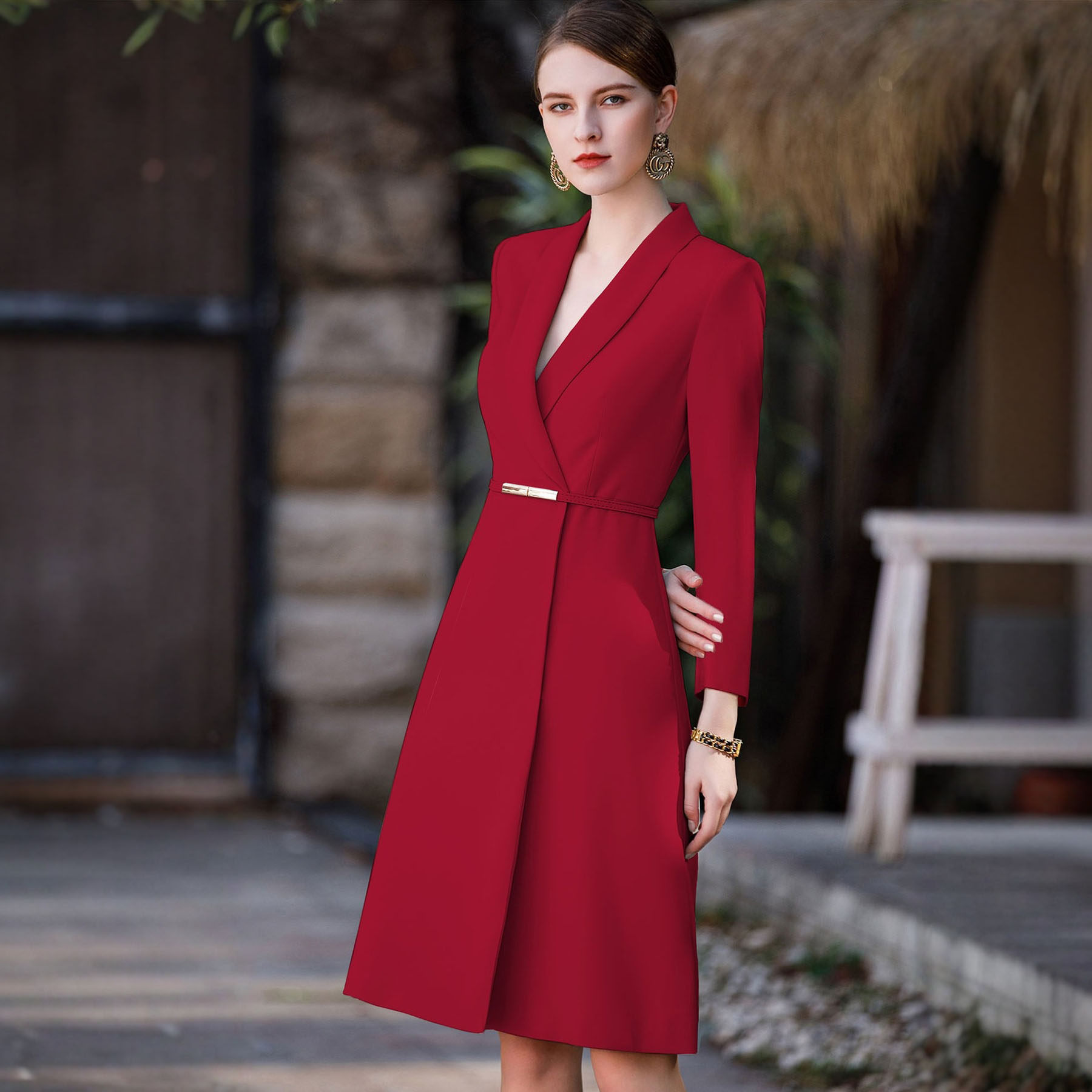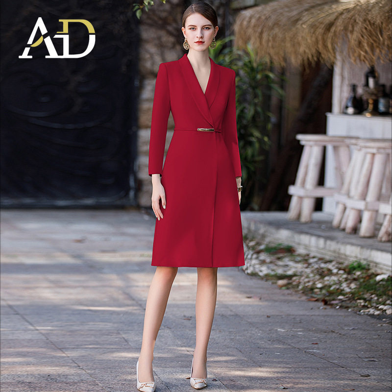 AD高端红色长袖主持人西装连衣裙女职业比赛演讲宴会庆典晚会礼服