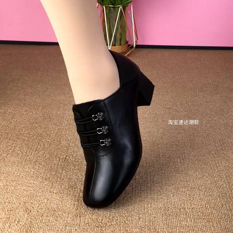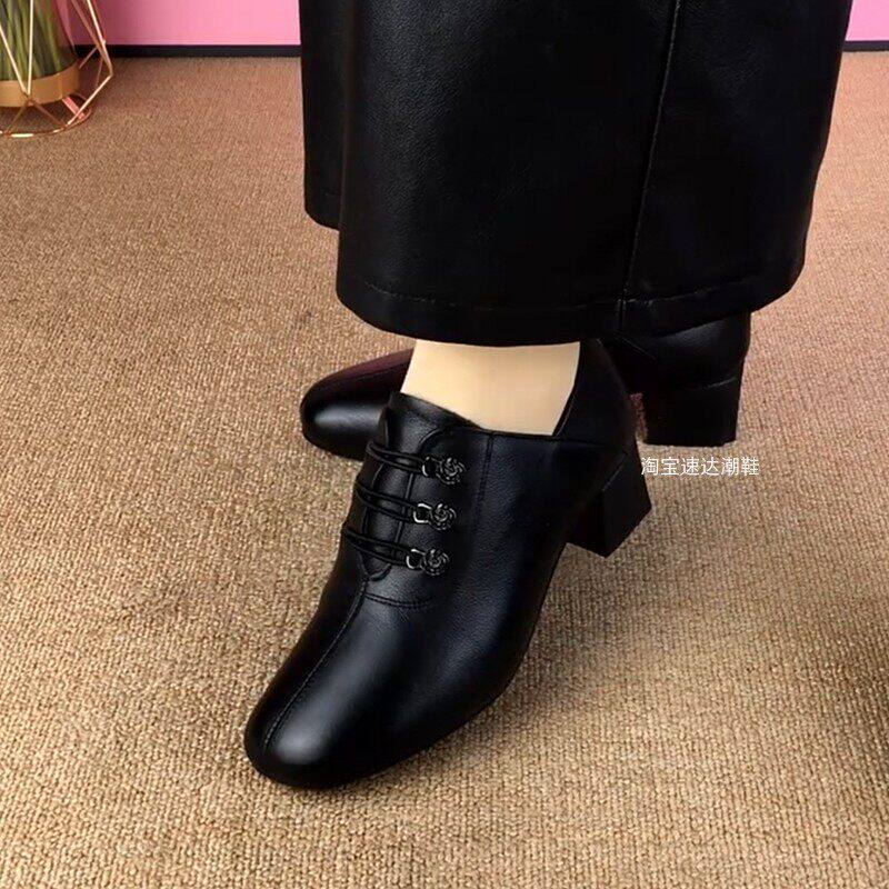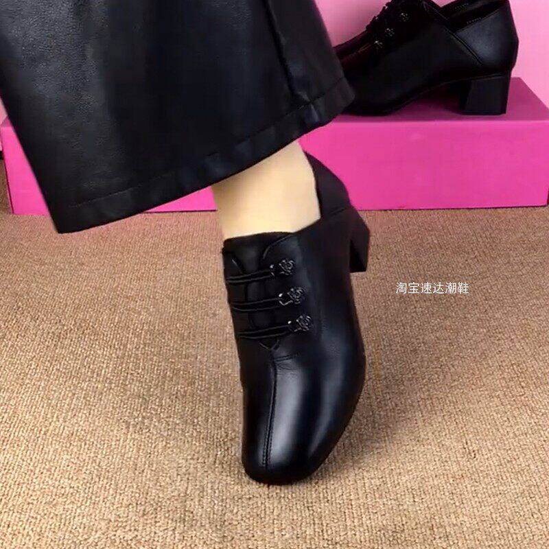 意尔康万达撤柜单鞋女2026秋新款真皮方头粗跟中跟女鞋一脚蹬软底