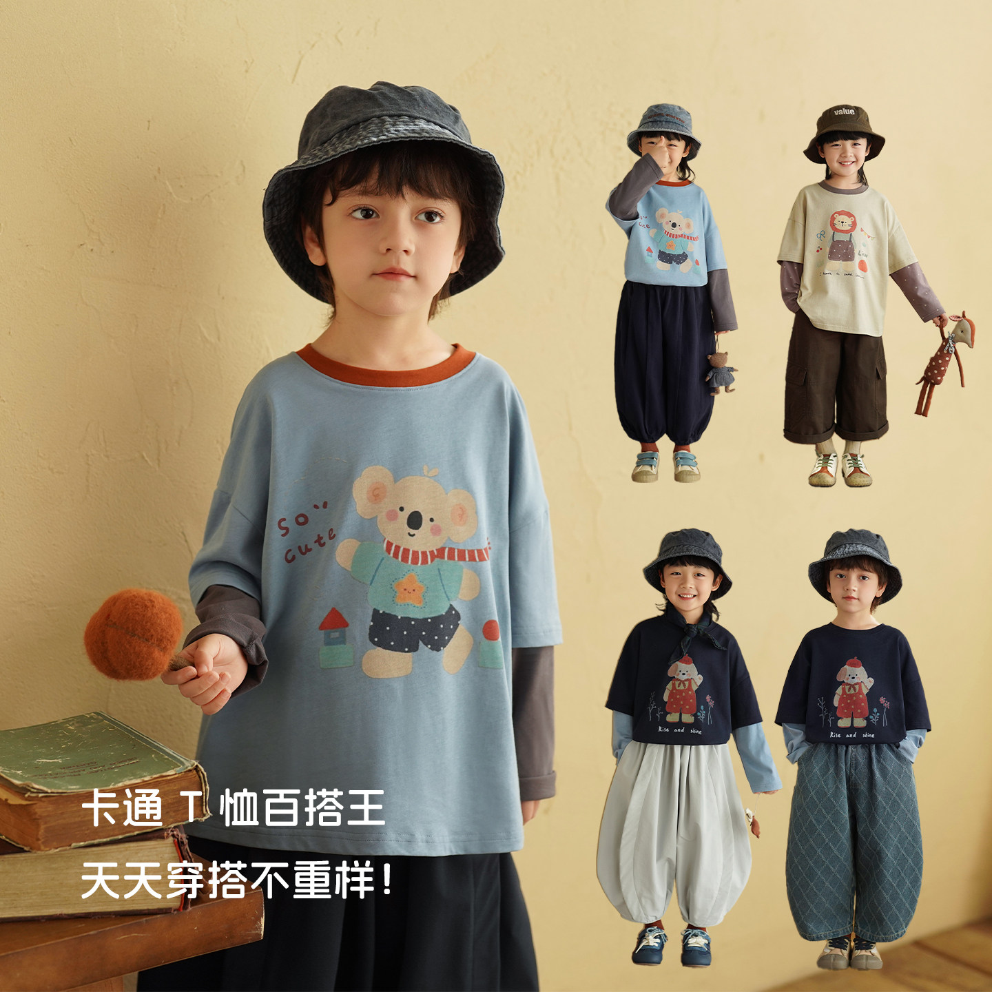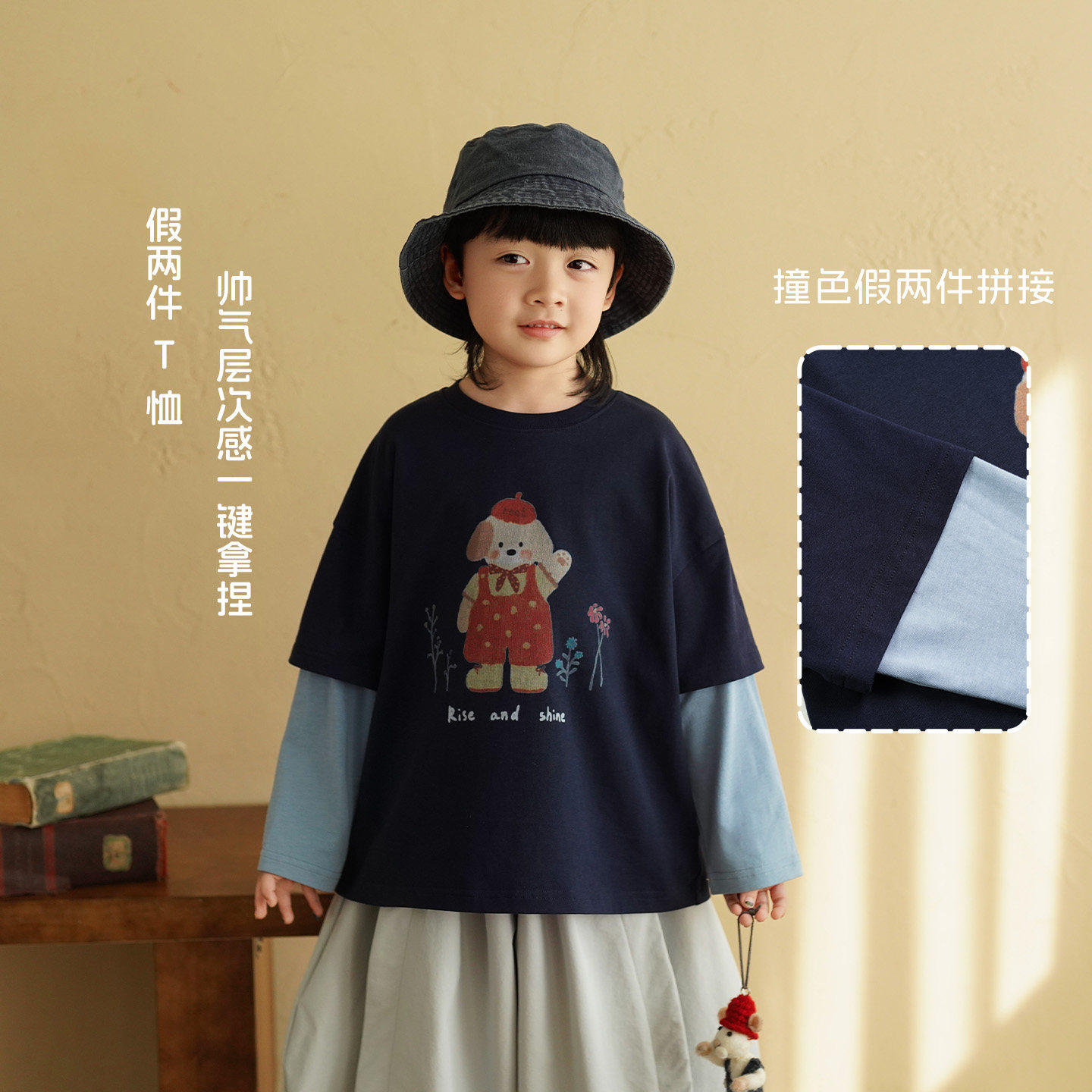 砚台家男童纯棉A类假两件T恤2026春装新款男宝宝长袖上衣儿童体恤