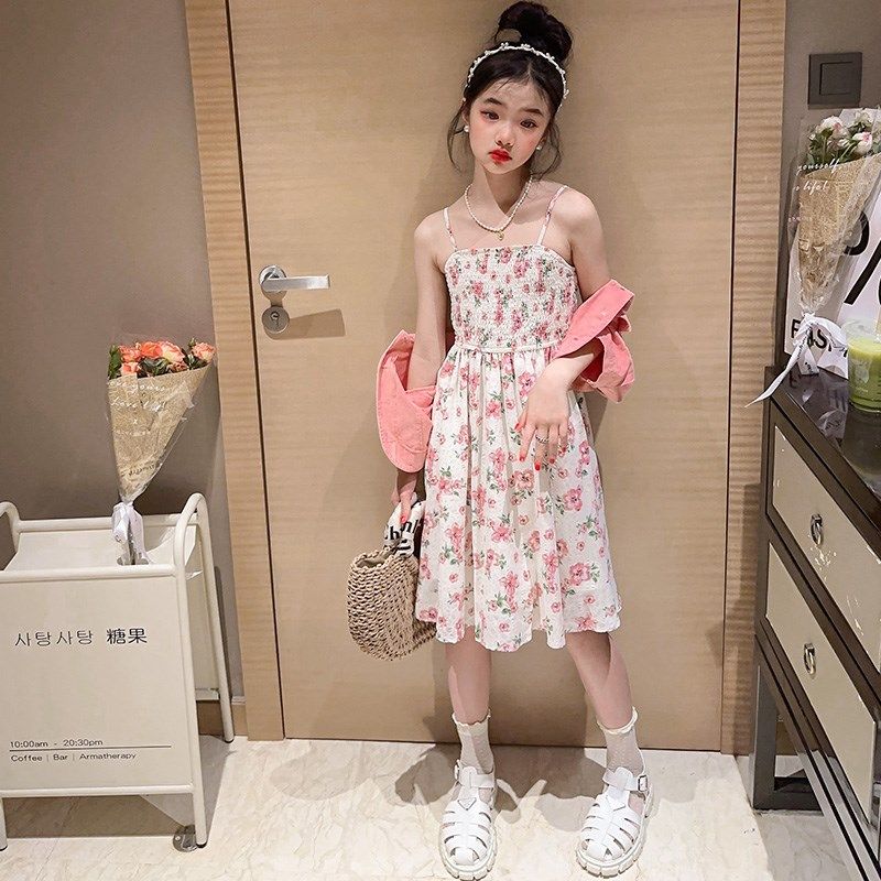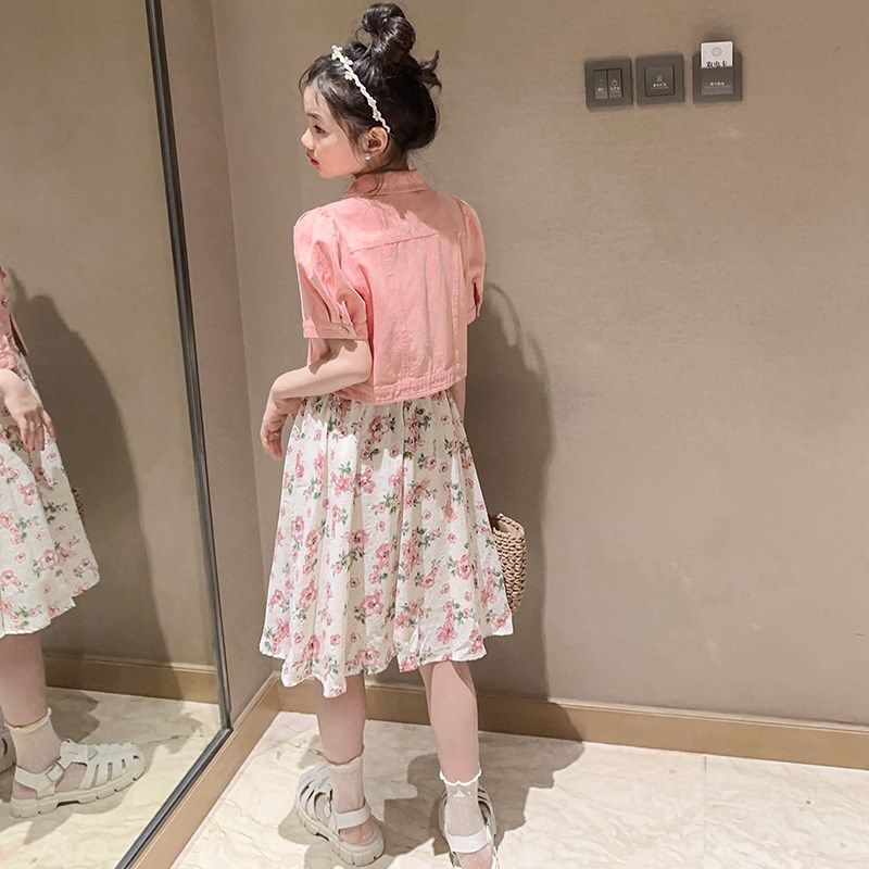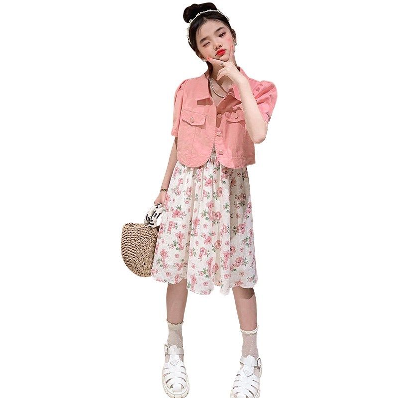 女童连衣裙洋气套装夏款洋气韩版短款外套碎花雪纺裙吊带裙两件套