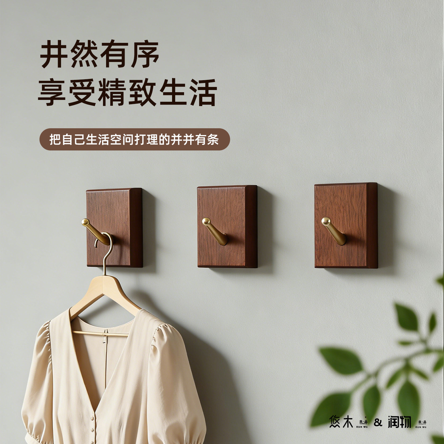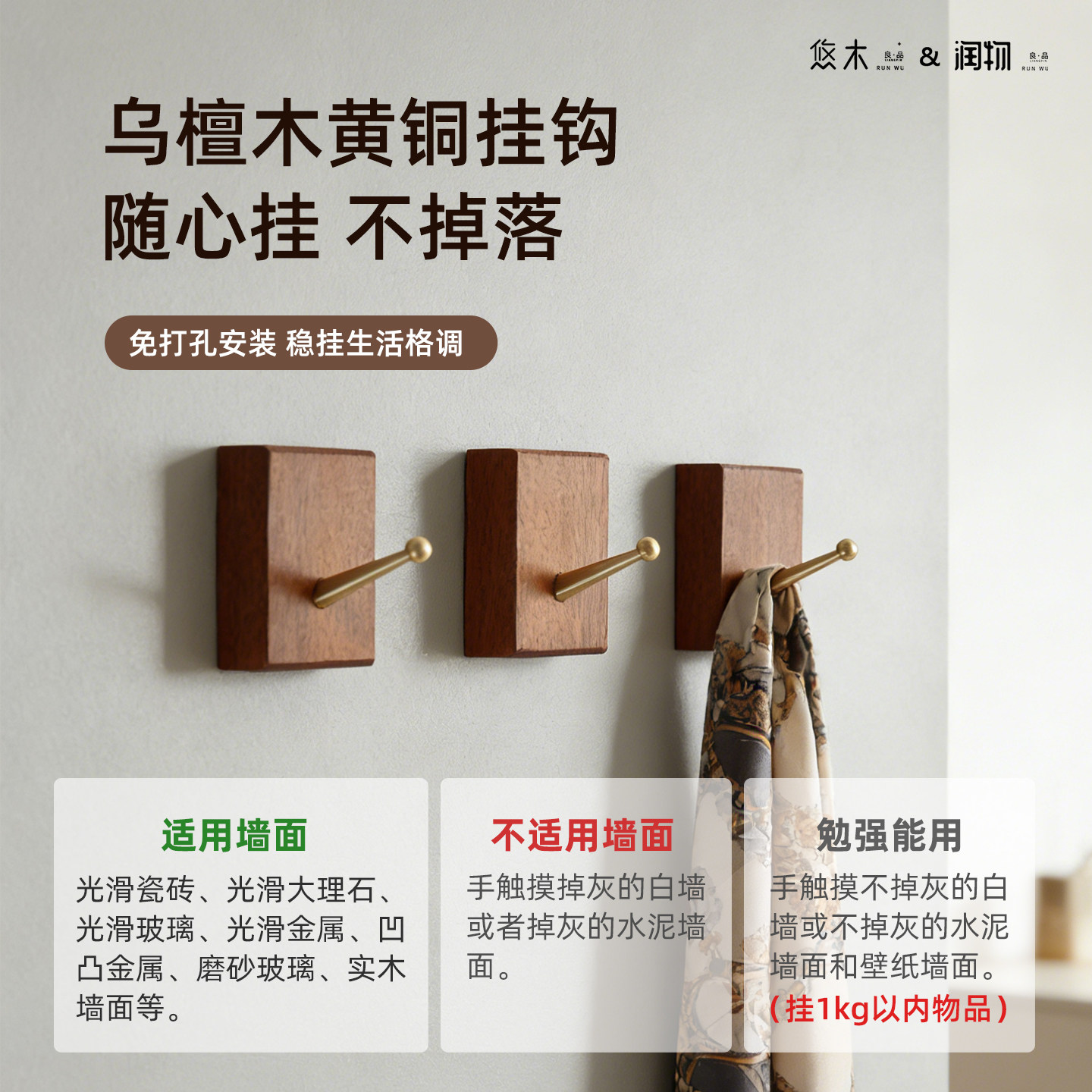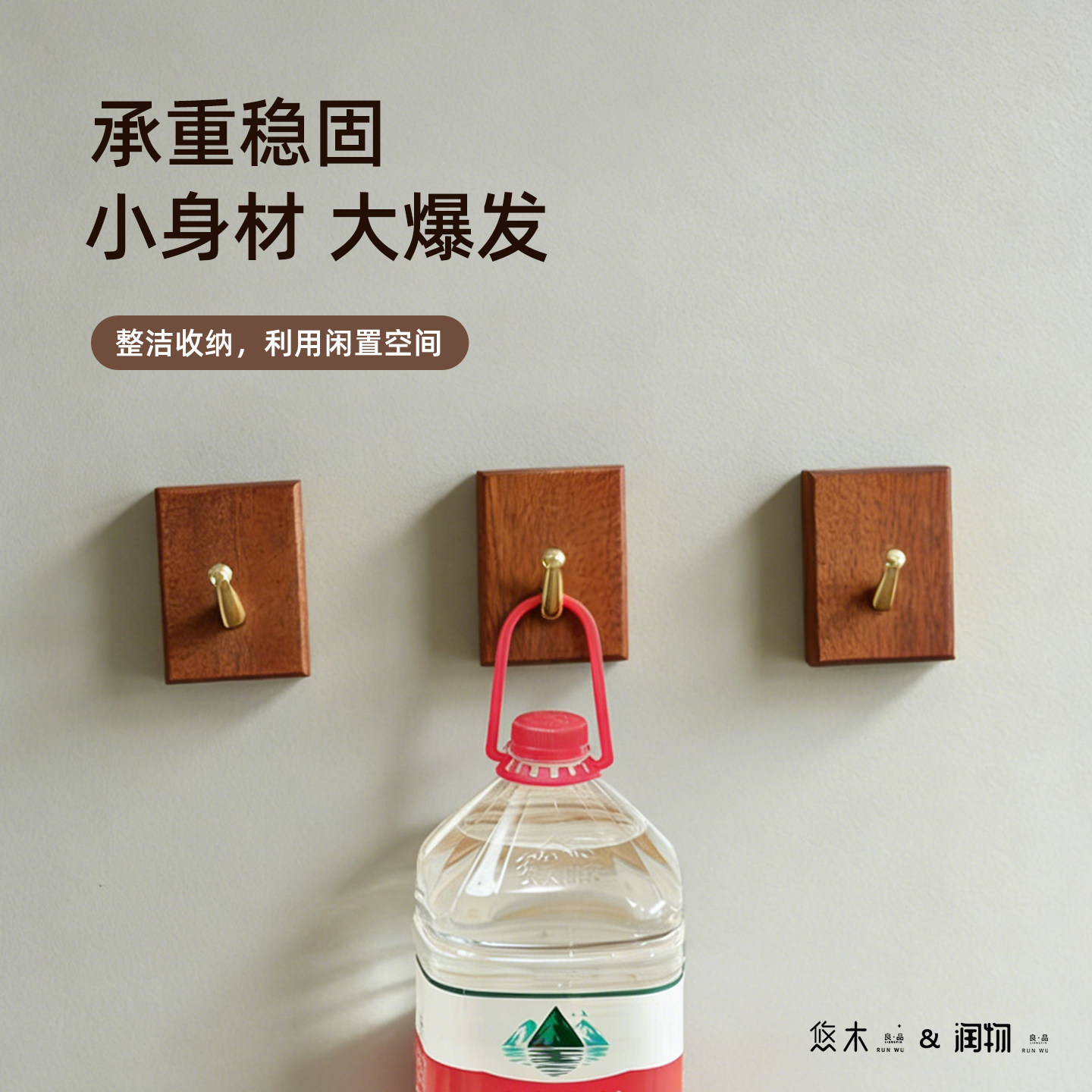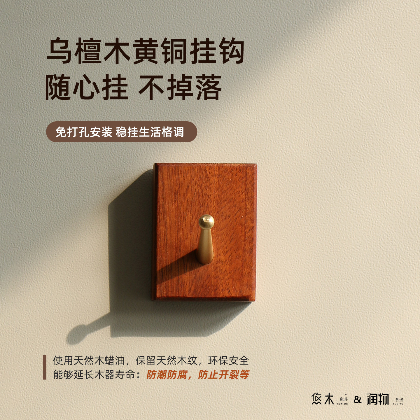 免打孔实木黄铜挂钩墙面上衣服粘钩画框挂钩客厅玄关单个壁挂衣钩