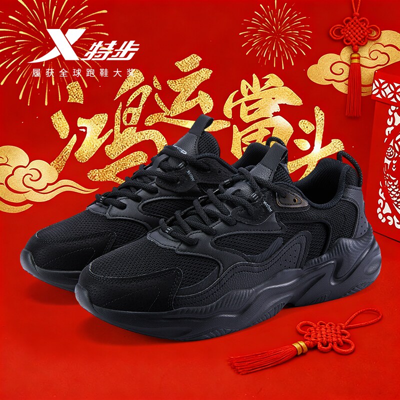 特步男鞋2026新款黑色运动鞋男网面软底跑步鞋新年百搭休闲老爹鞋
