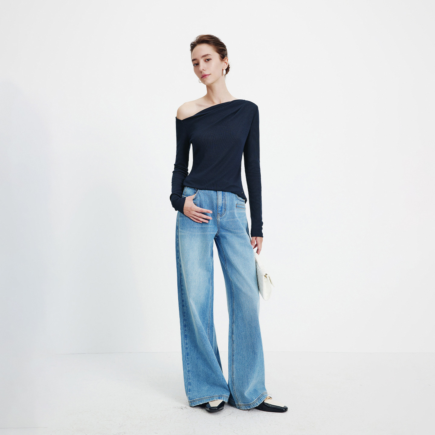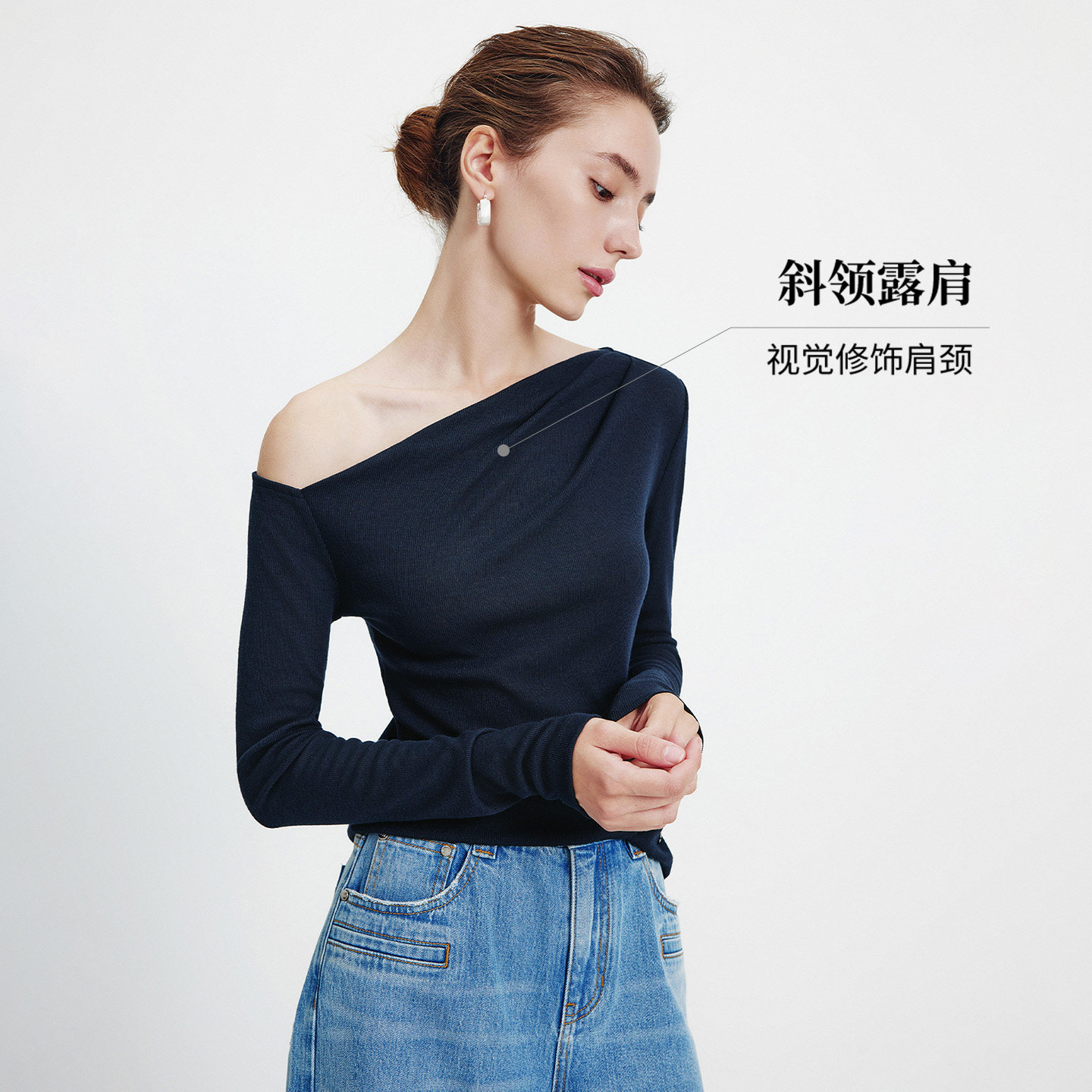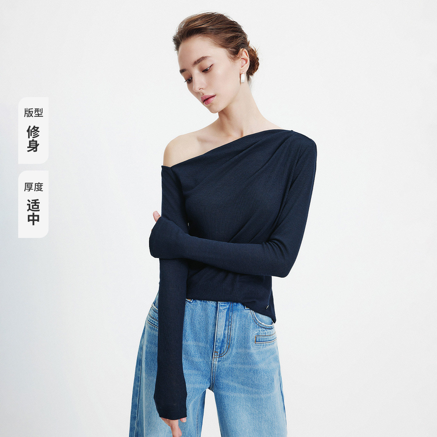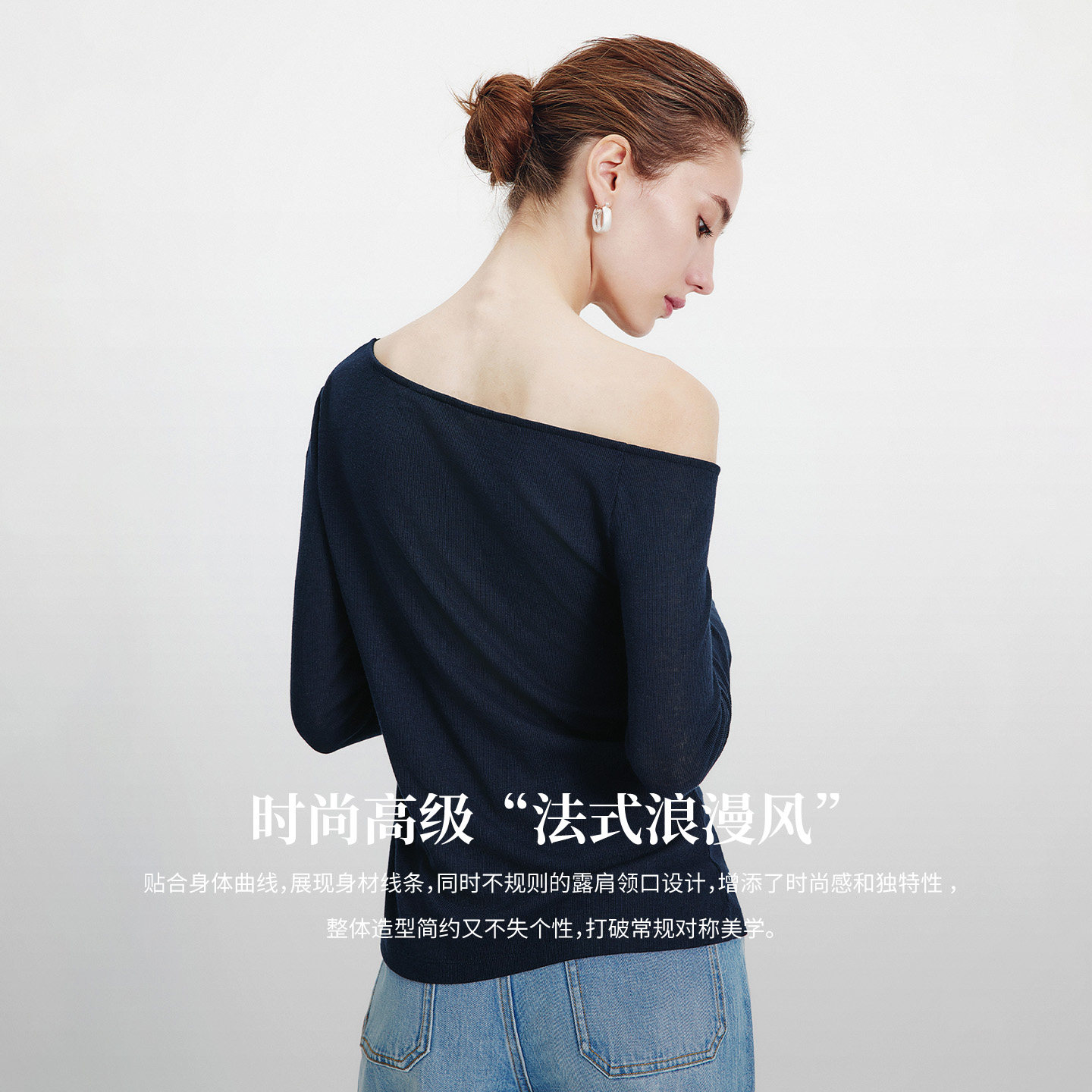 Navigare意大利小帆船春季新款女士法式斜肩长袖T恤修身露肩上衣