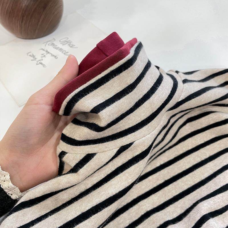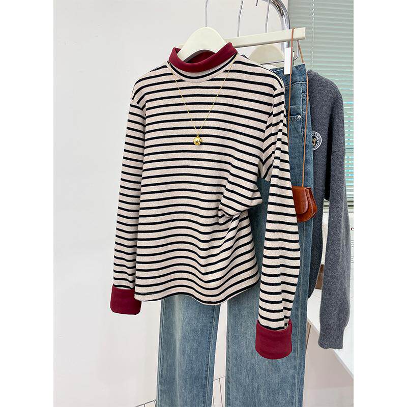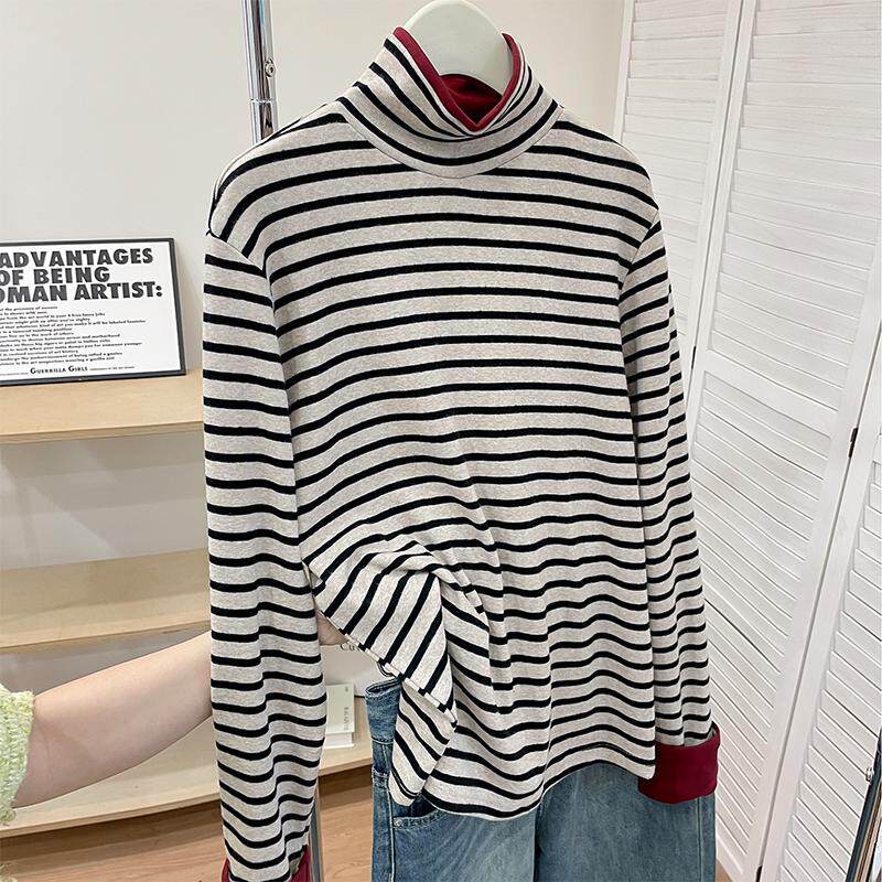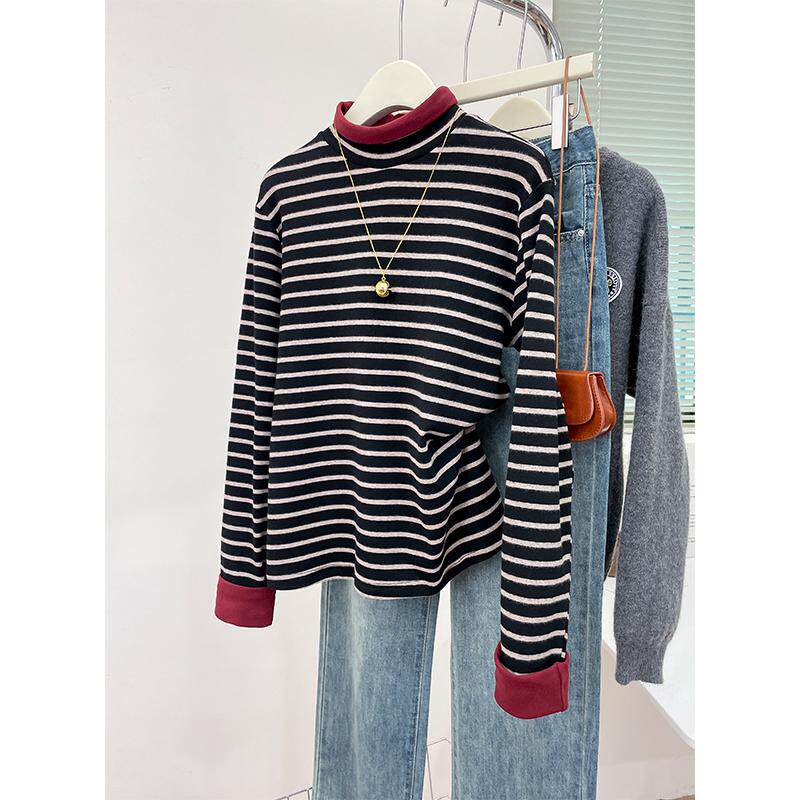 撞色条纹半高领长袖T恤女春季新款大码百搭上衣宽松显瘦打底衫冬