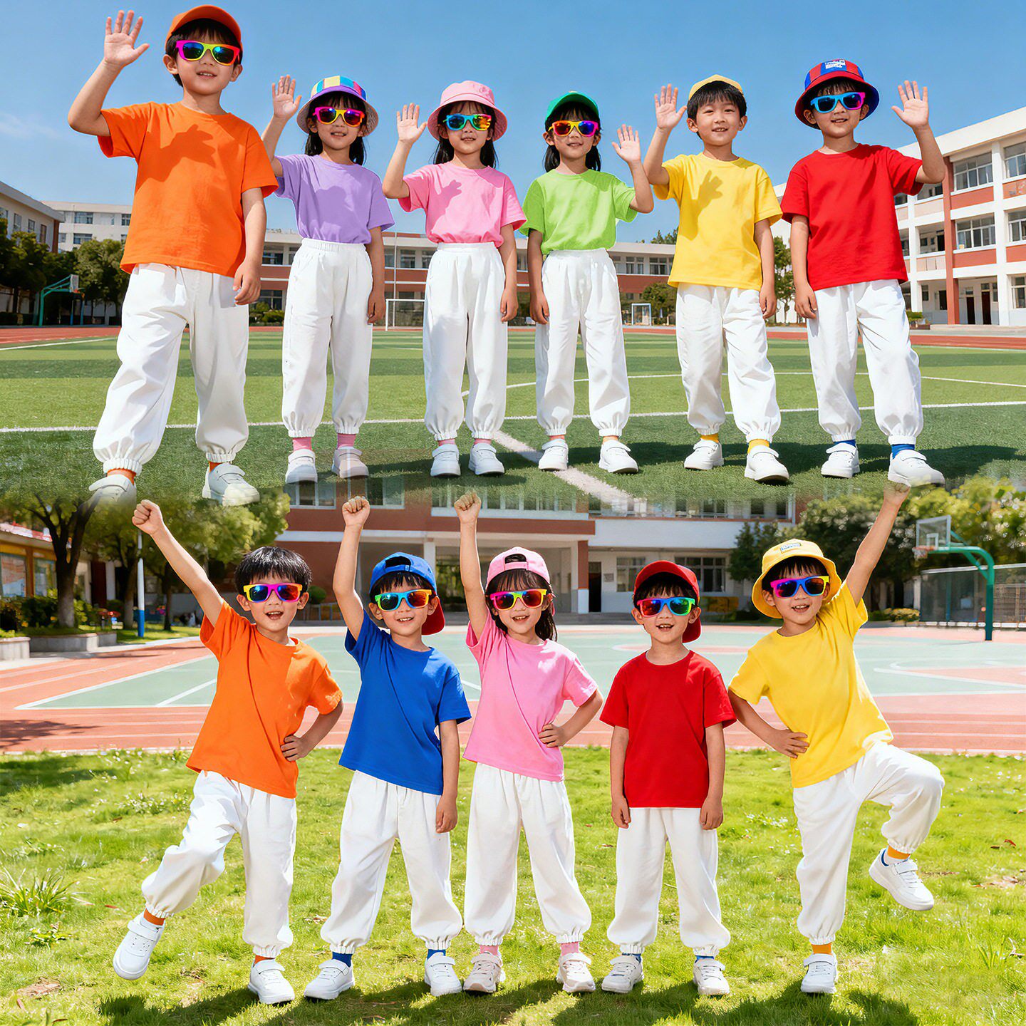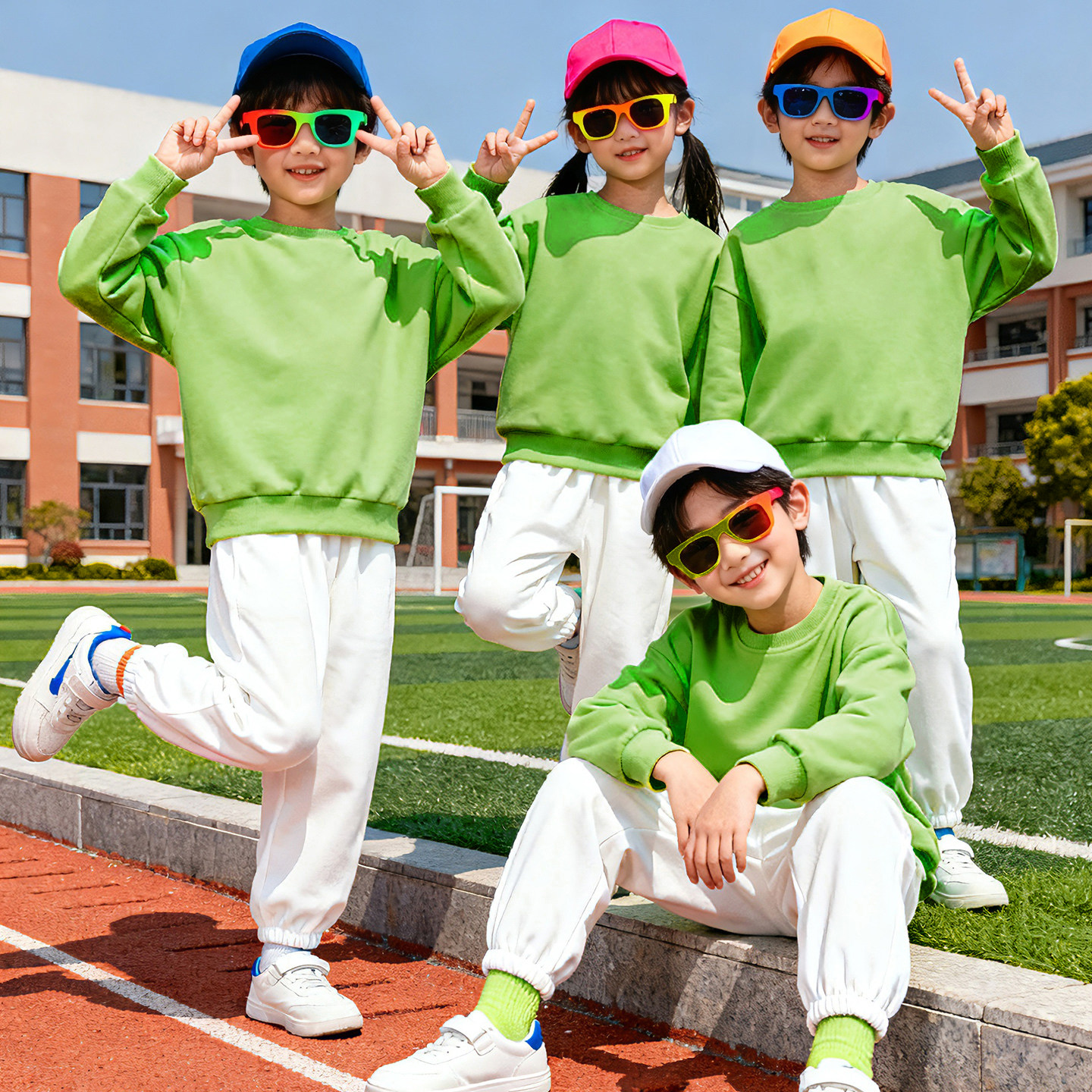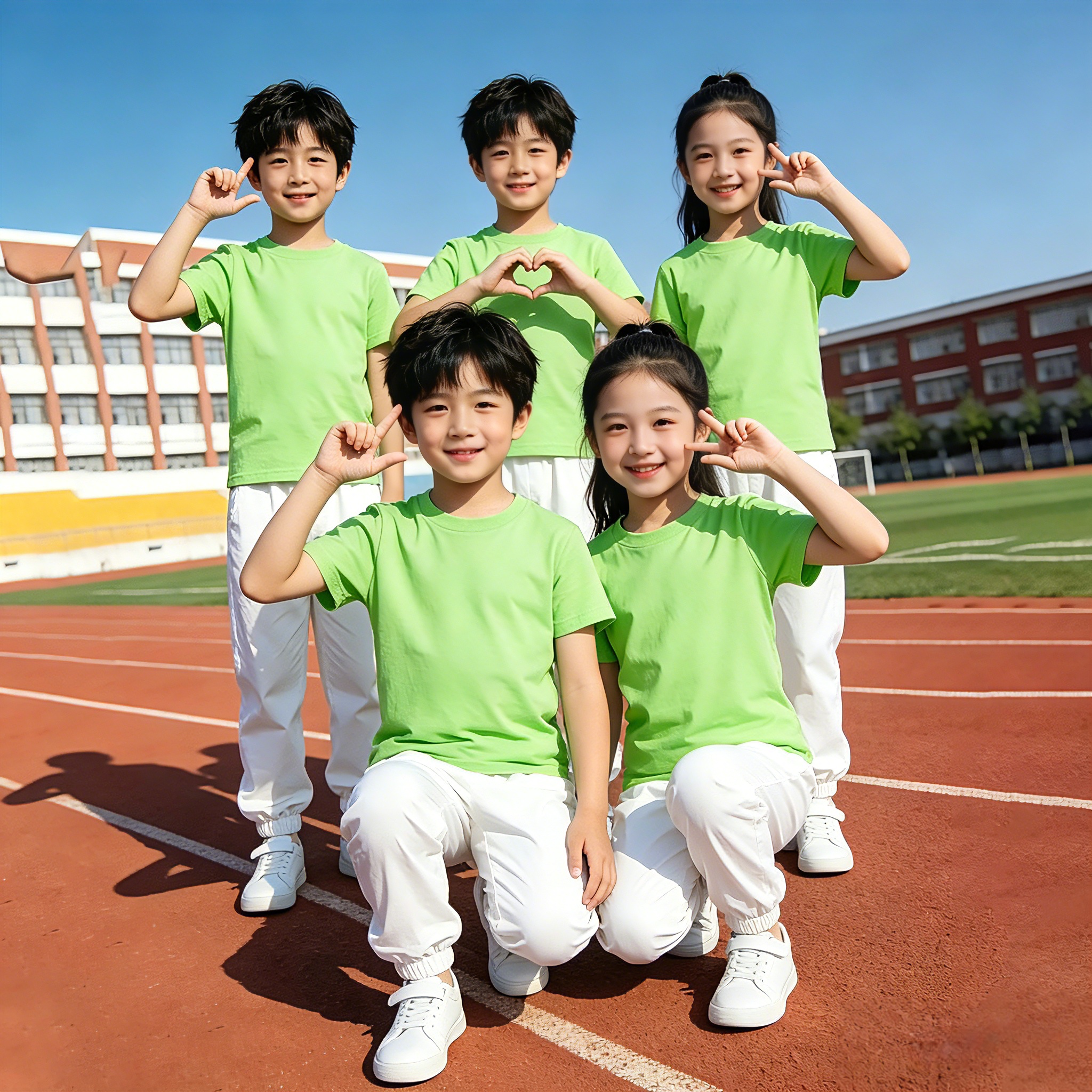 荧光绿t恤白色长裤儿童套装幼儿园亲子绿色短袖小学生运动会班服