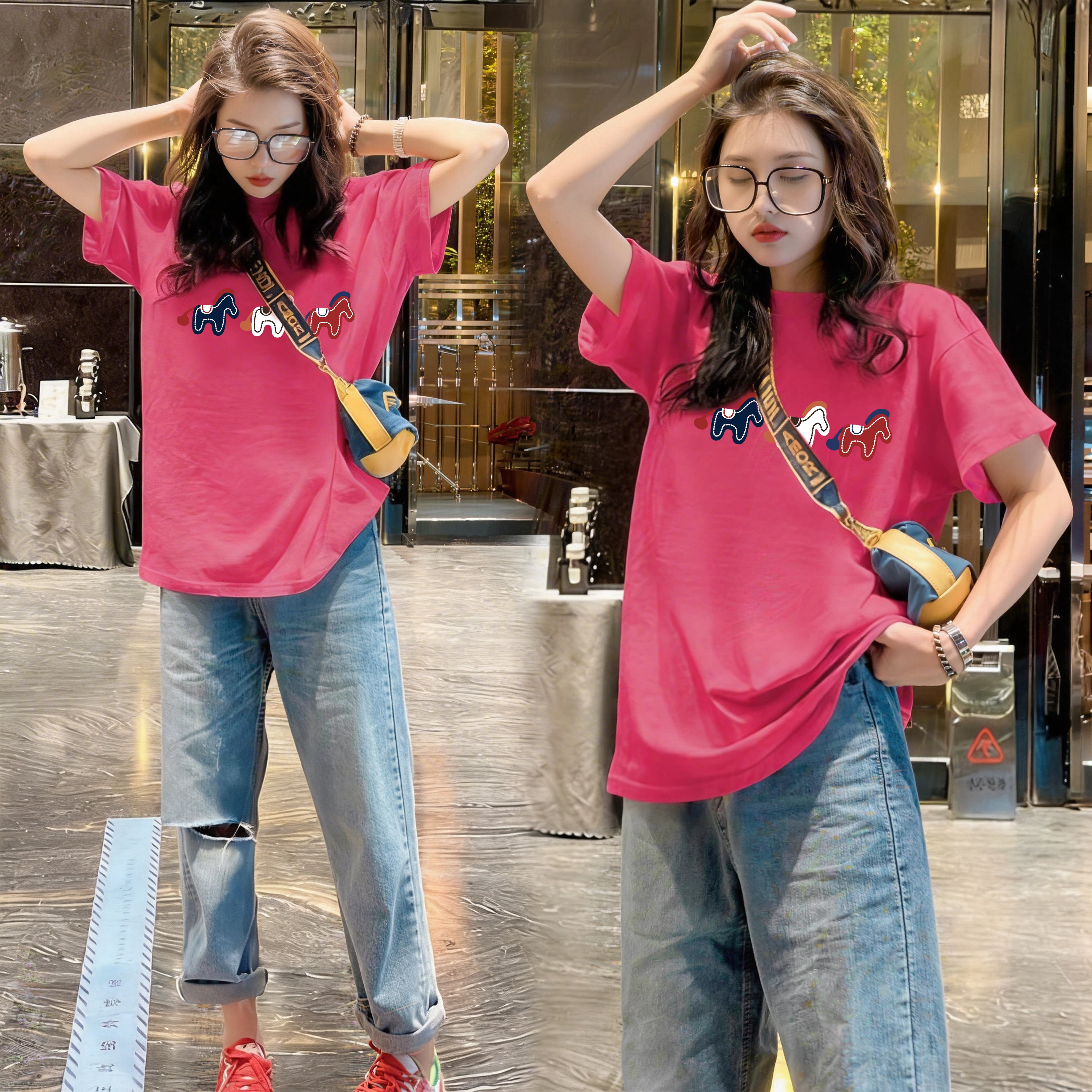 纯棉短袖t恤女2026新款宽松胖mm大码女装休闲印花粉色上衣女夏季