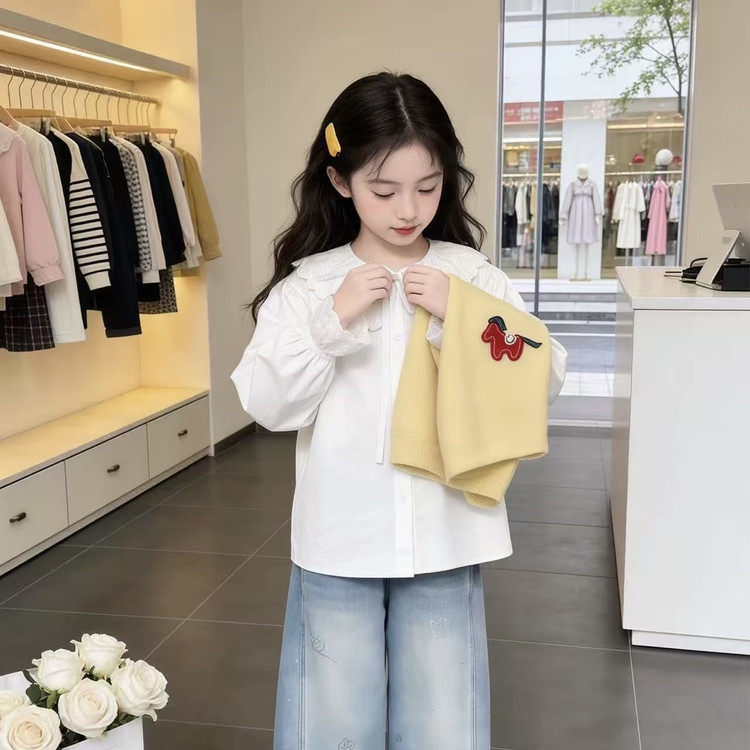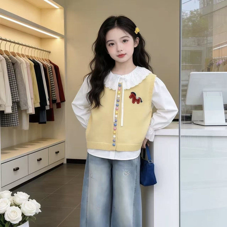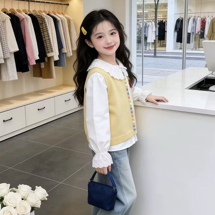 女童套装春季2026新款中大童彩虹扣马甲娃娃领衬衫初中生两件套