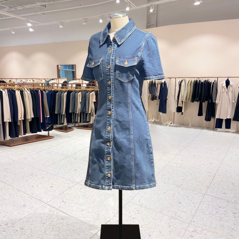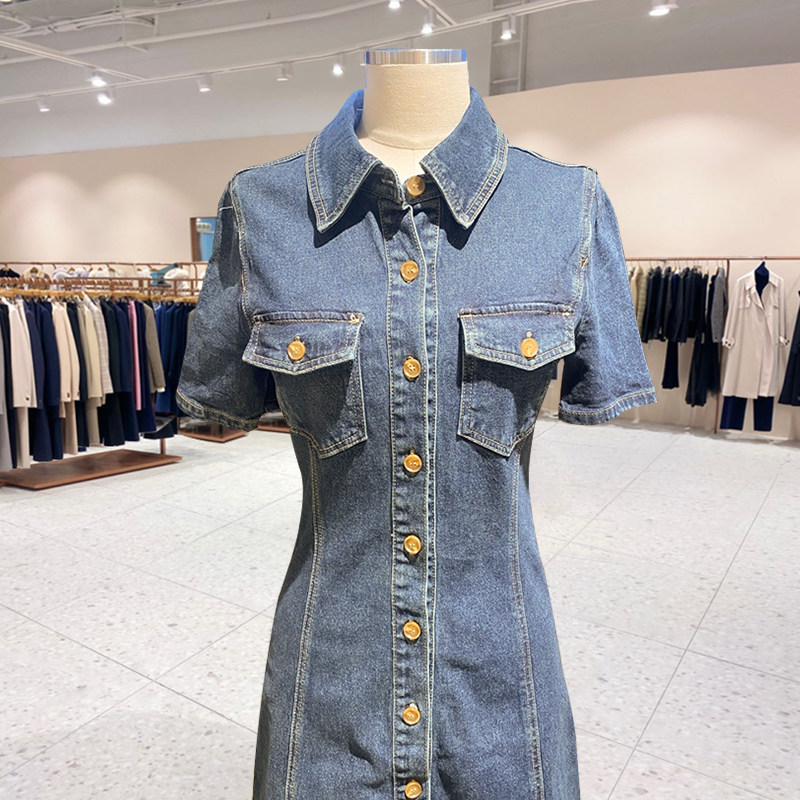 2025年新款短袖连衣裙牛仔连衣裙复古修身显瘦小个子时尚蓝色裙子