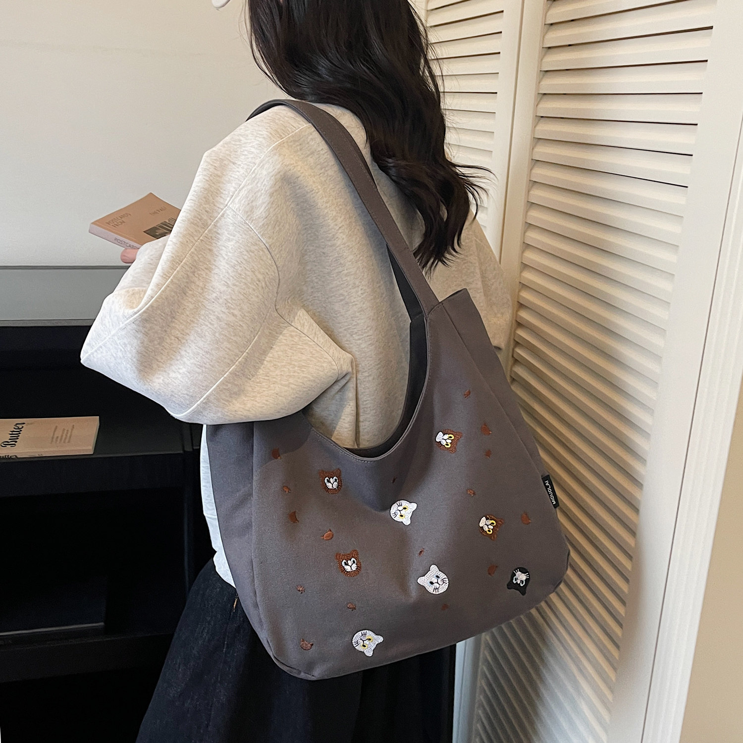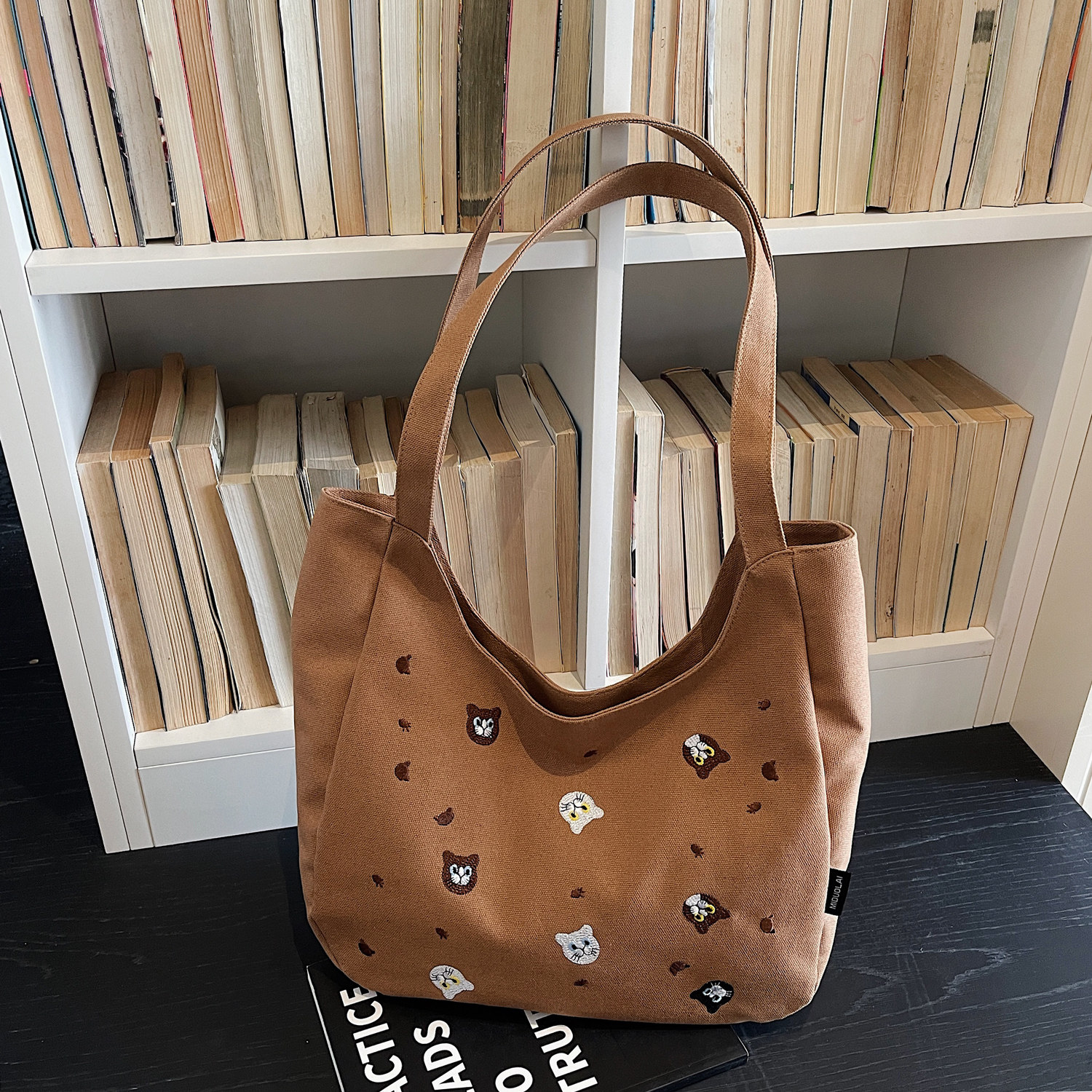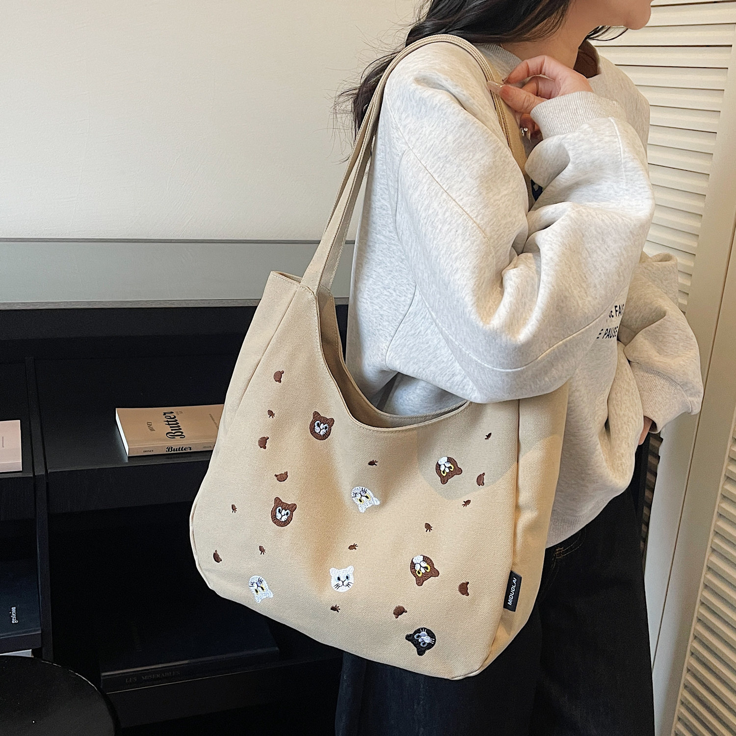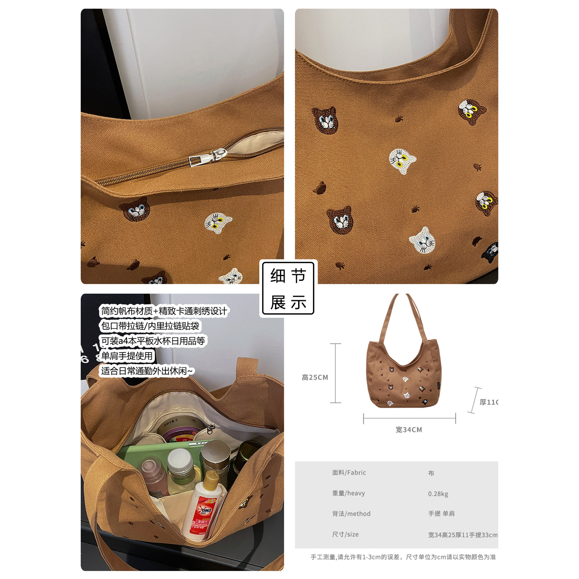 带拉链帆布包包女2026新款潮小猫刺绣休闲托特包大容量通勤单肩包