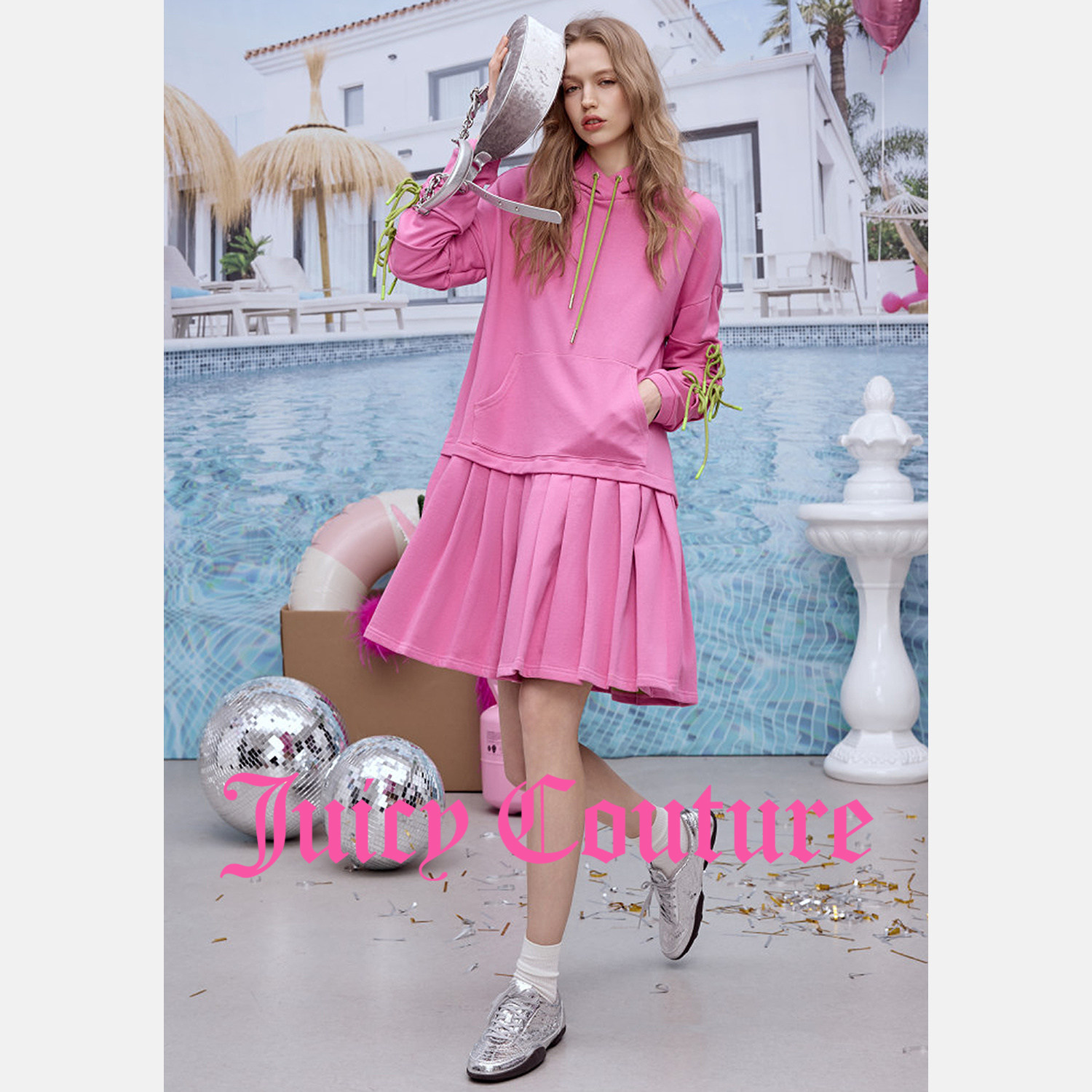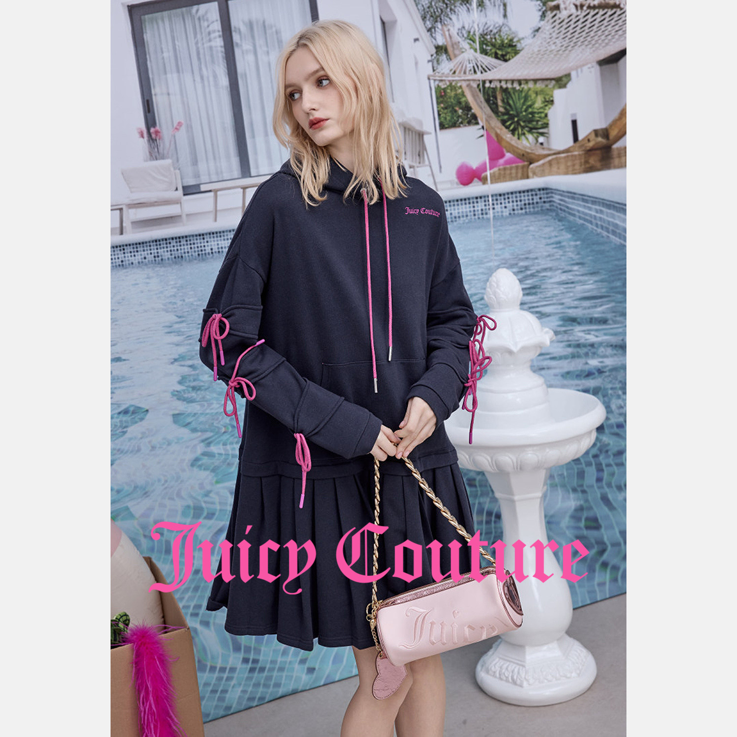 Juicy Couture橘滋连衣裙女26春夏新款灰粉撞色百褶卫衣短裙子