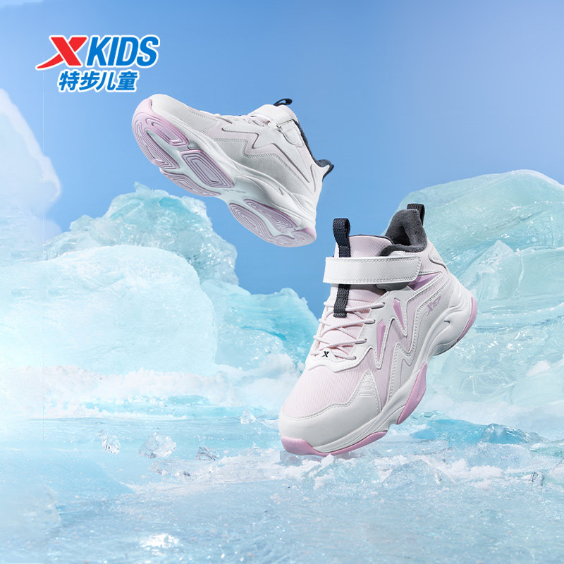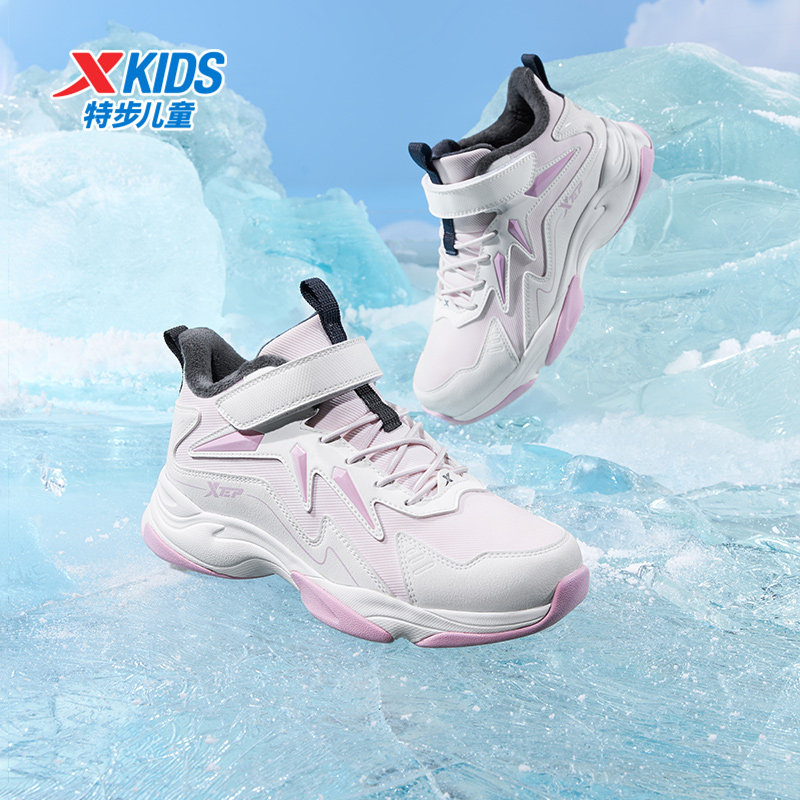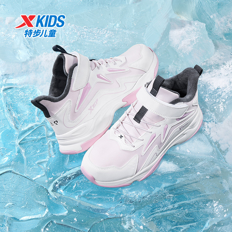 特步童鞋冬季女童中大童加绒魔术贴中帮防滑耐磨运动儿童休闲棉鞋