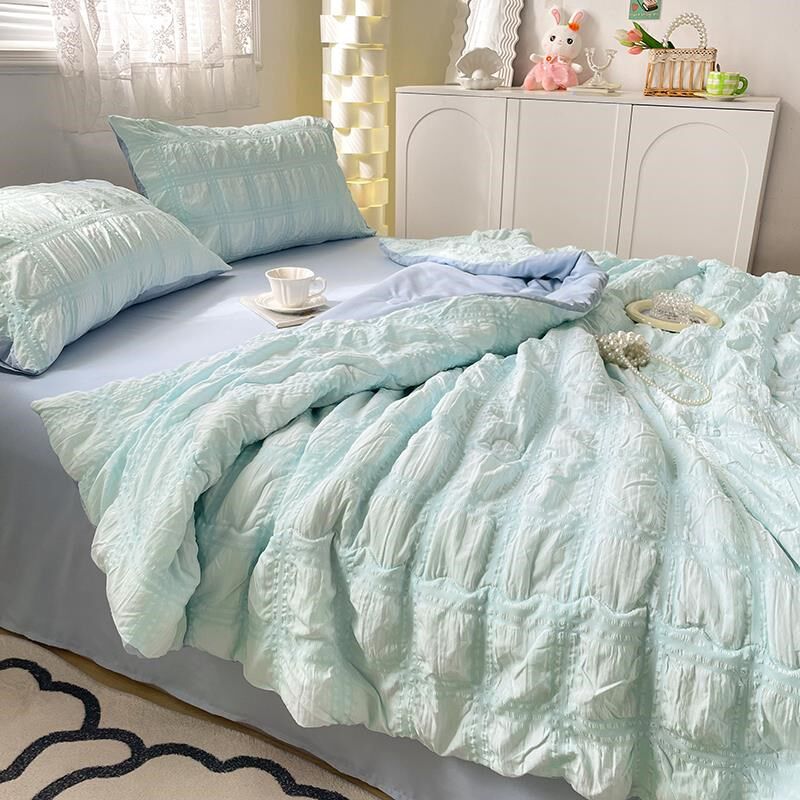 直销泡泡纱蓝色空调被夏凉被床上四件套床裙薄款被子床Z笠夏季可