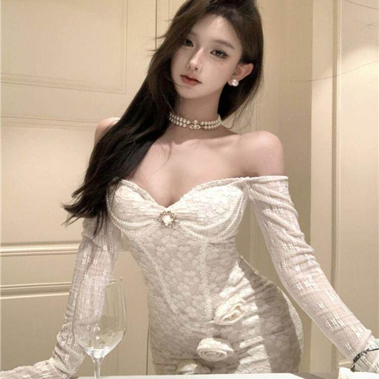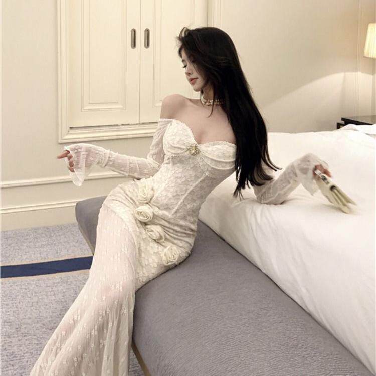 一字肩白色花朵长袖连衣裙女秋季设计感修身长裙纯欲收腰包臀裙子