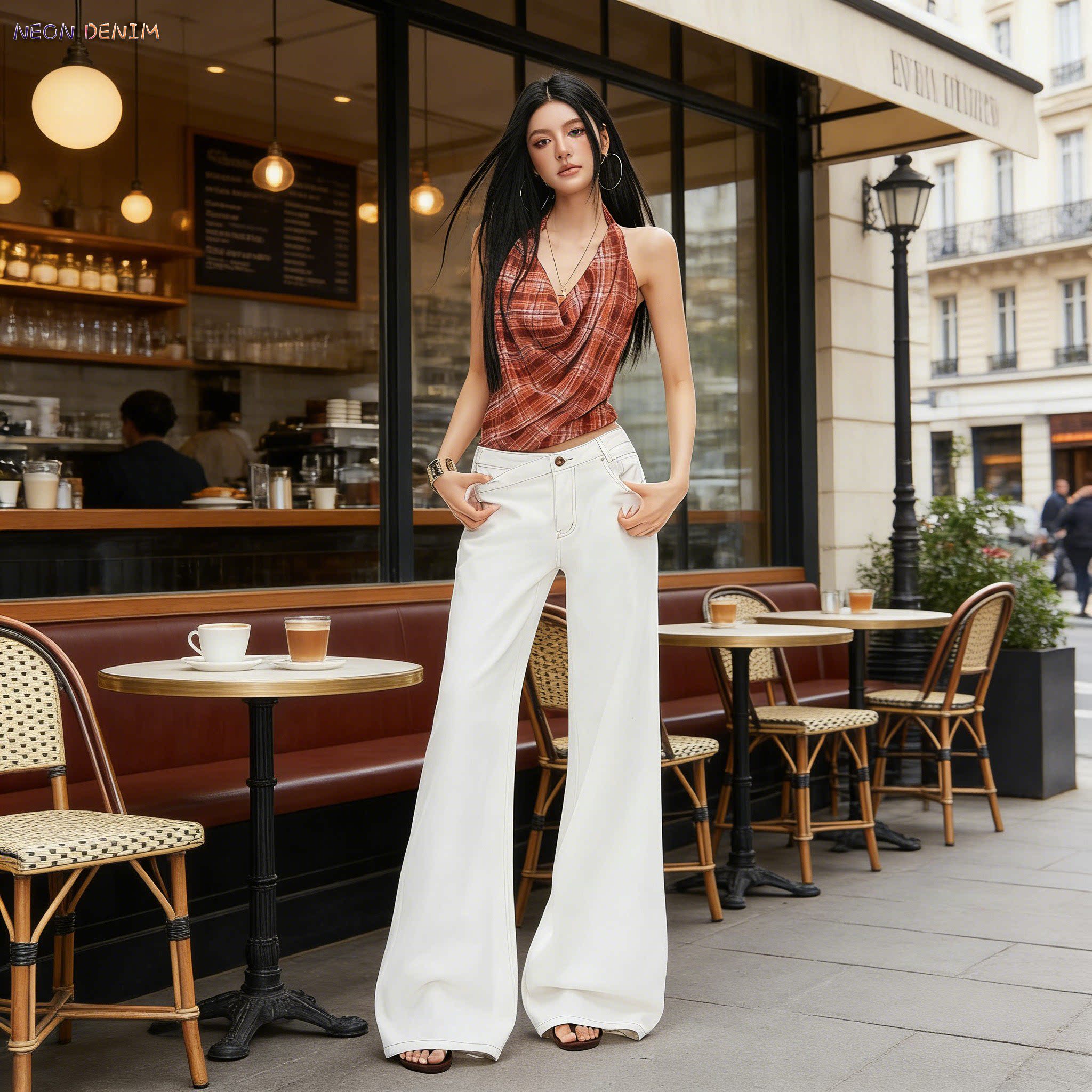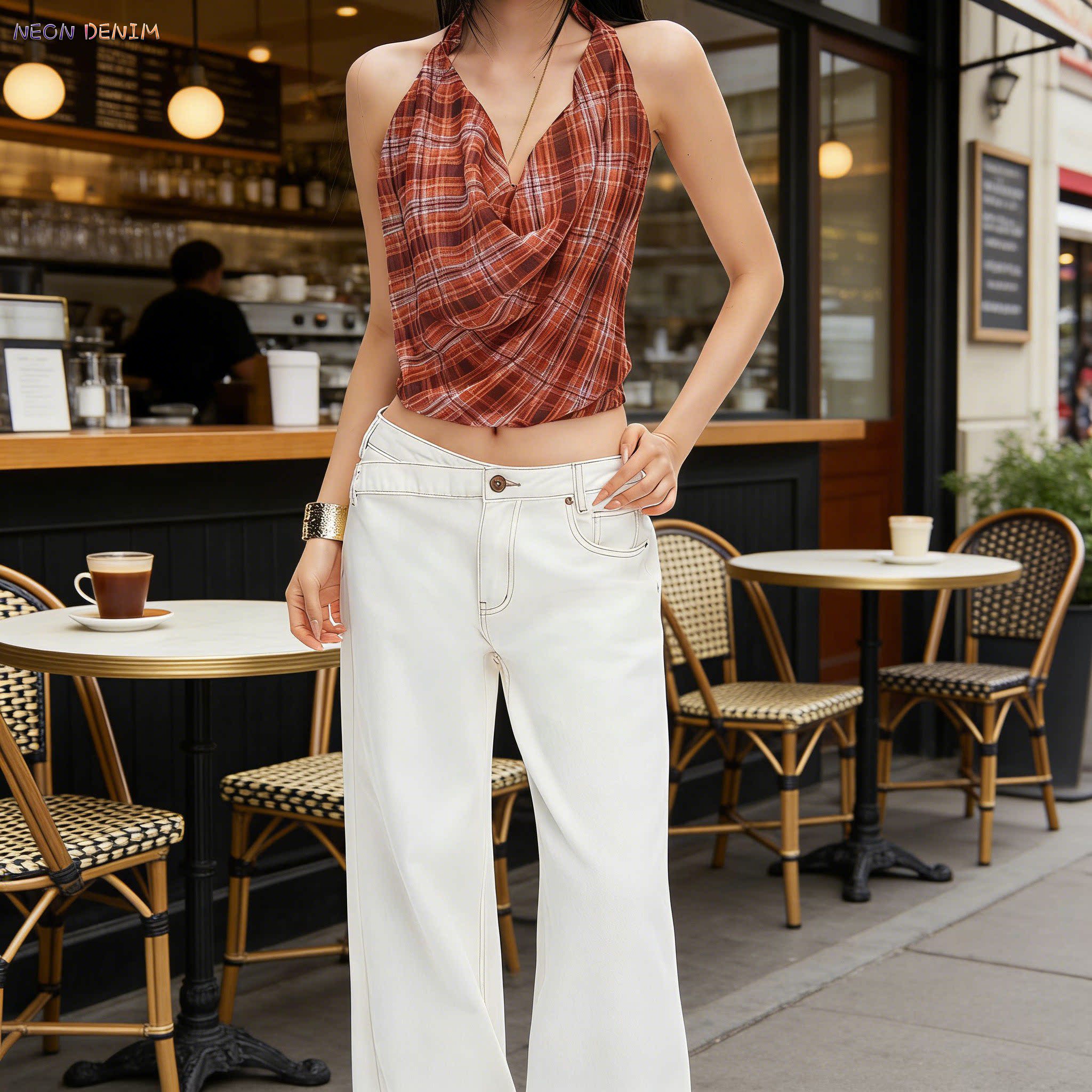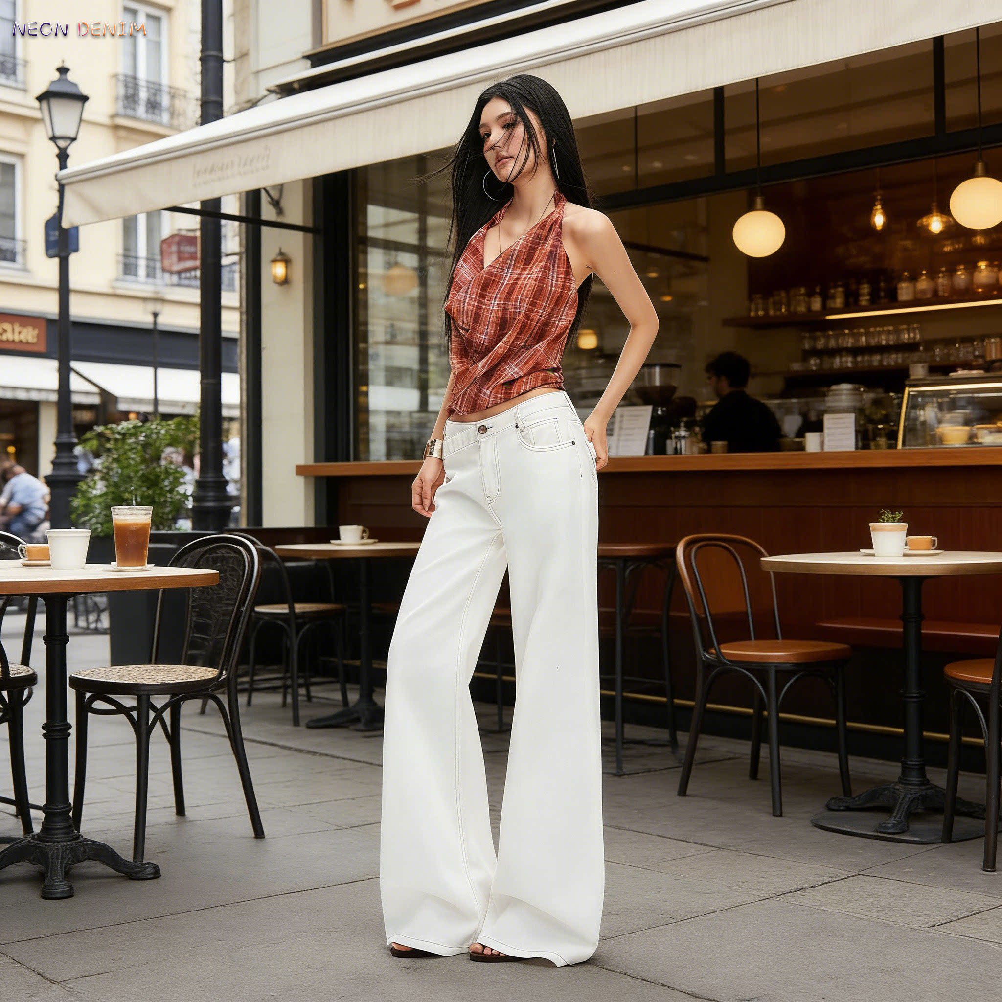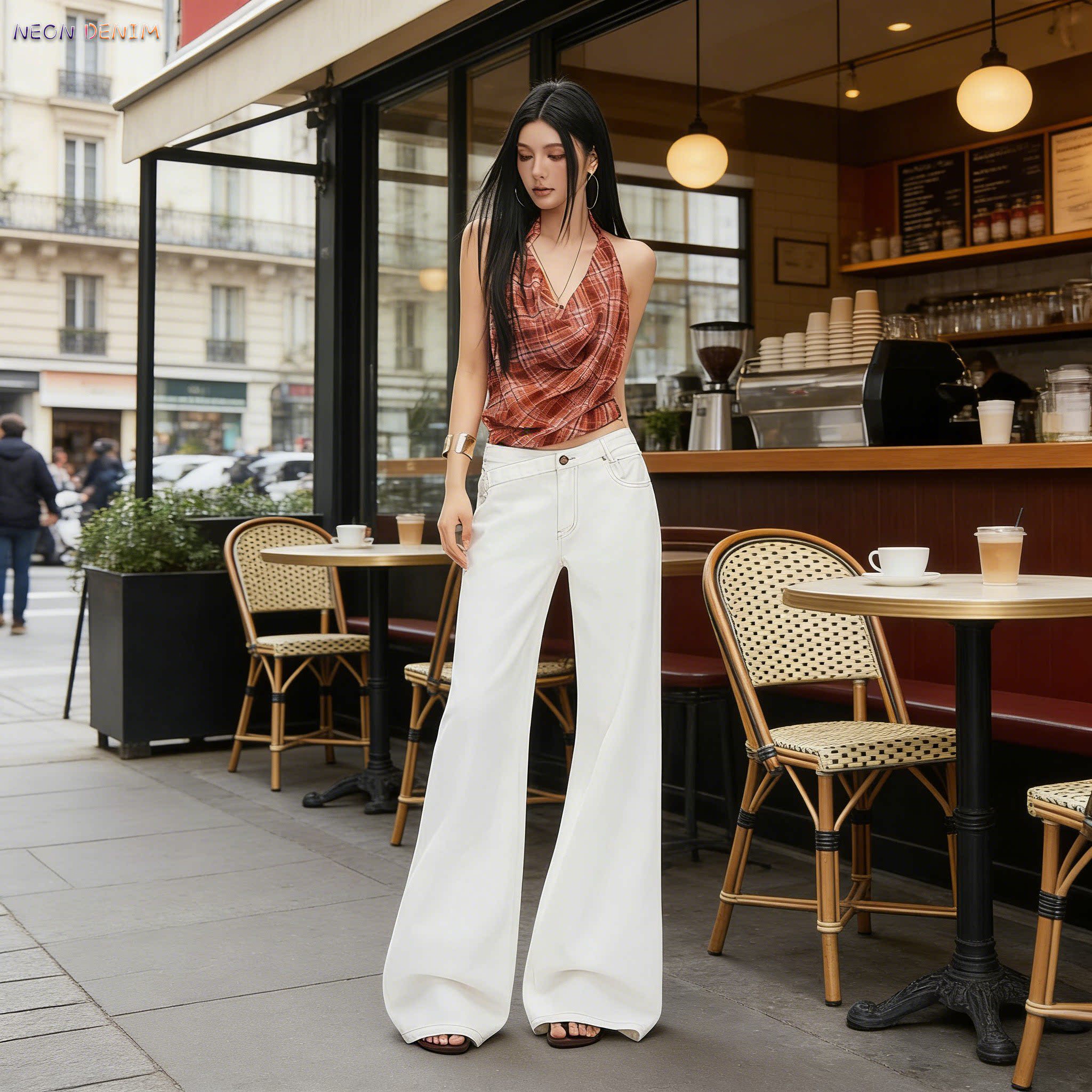 白色V腰设计感直筒喇叭牛仔裤女2026春夏新款宽松不贴腿微喇裤子