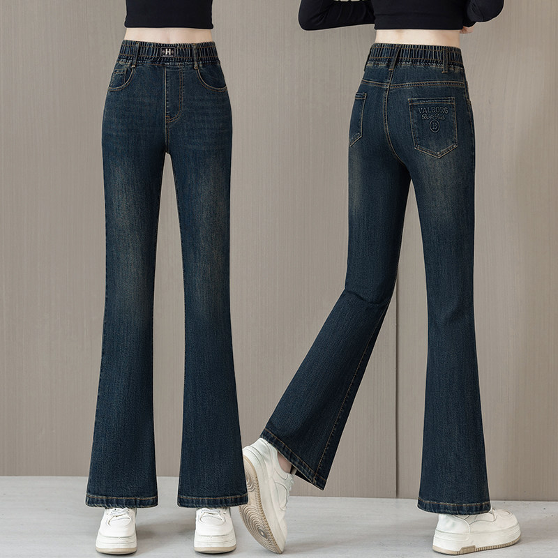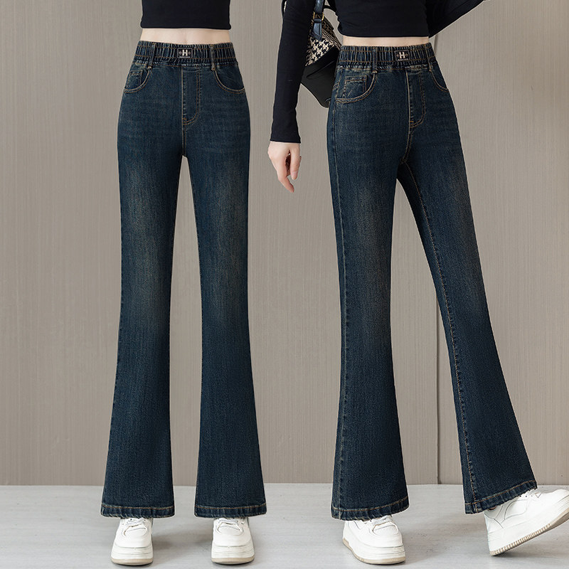 加绒松紧腰微喇牛仔裤女冬季2025新款加厚马蹄裤高腰喇叭裤阔腿裤