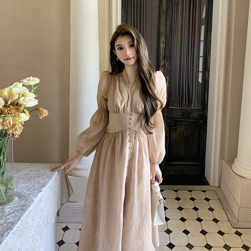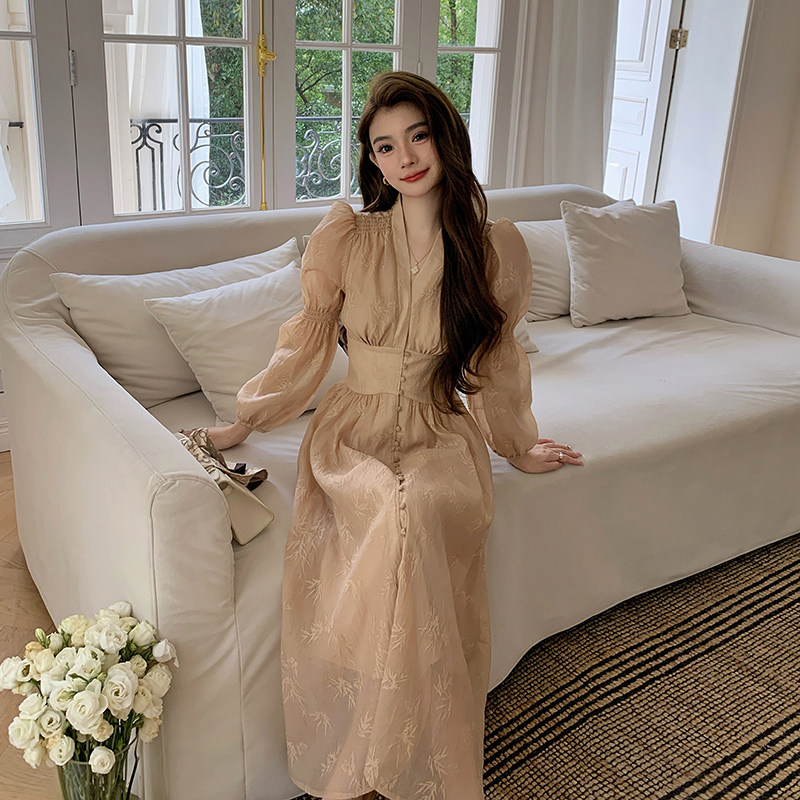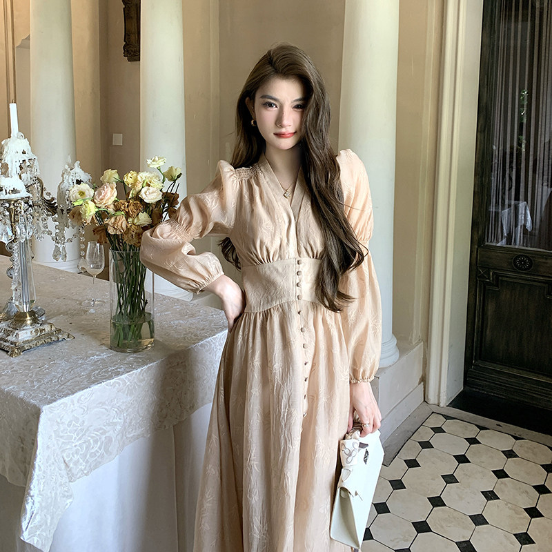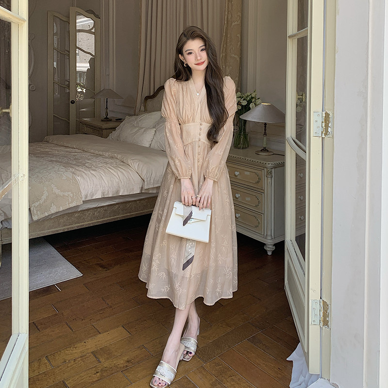 AM NANA秋季法式气质长袖连衣裙温柔风初恋小个子绝美V领长裙子