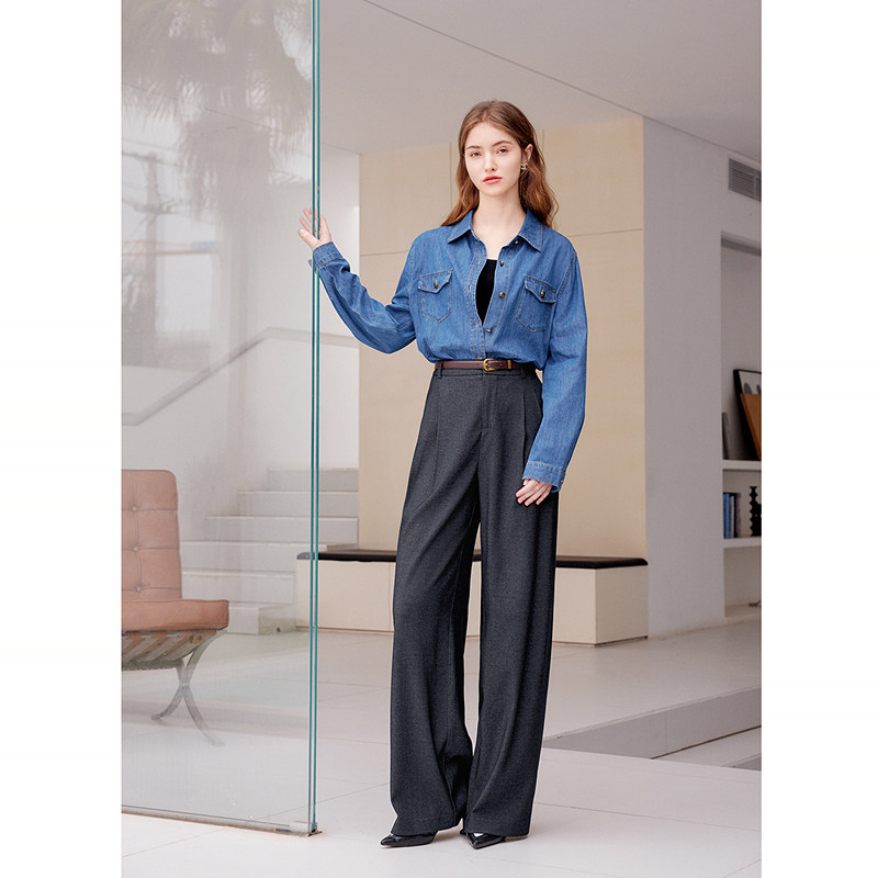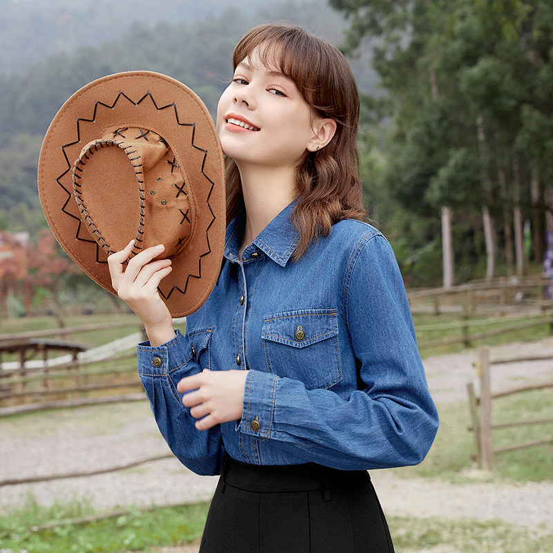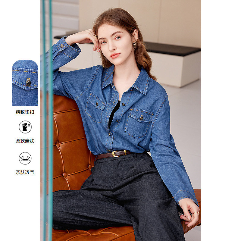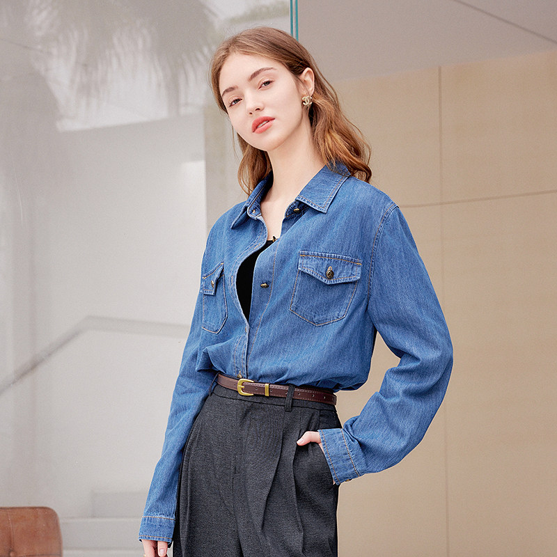 betu百图工装口袋牛仔衬衫新款新款复古翻领金属纽扣长袖衫衫