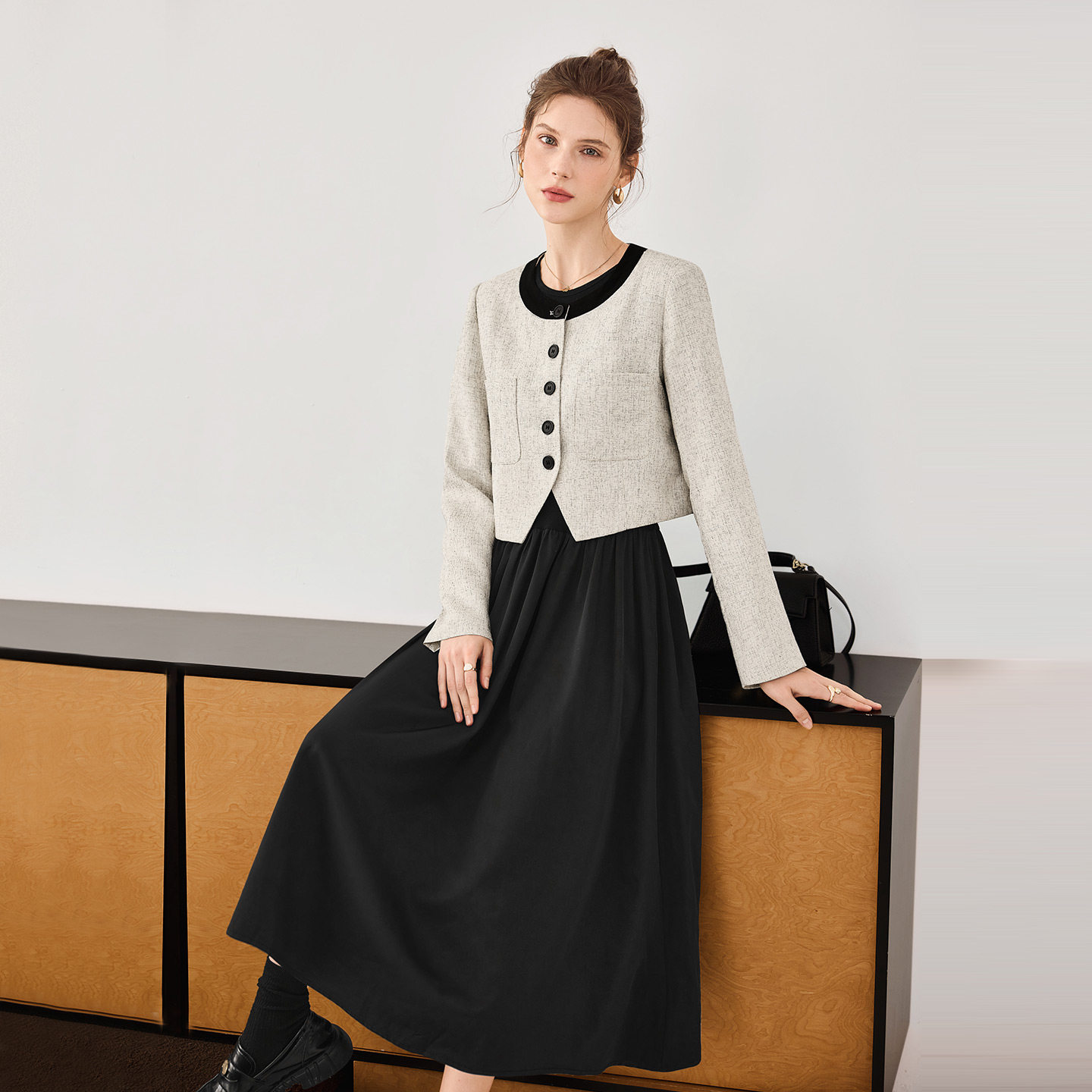 她池时尚套装2026春装新款女装圆领小香风外套搭无袖连衣裙两件套