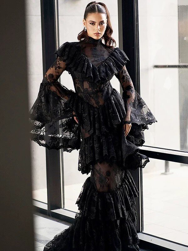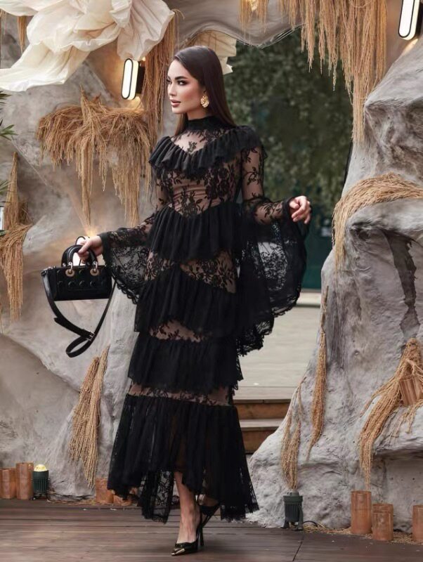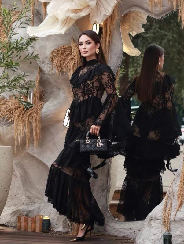2026早春新品欧美风重工连衣裙生日宴会礼服裙立领刺绣荷叶边长裙